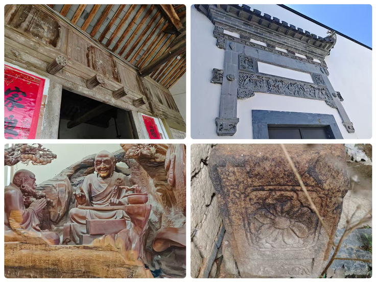 文化溯源:三雕里的历史基因与美学密码 徽州三雕作为中国传统民间雕刻艺术的瑰宝,承载着徽州人“崇文重教、天人合一”的精神追求。实践团深入古街深巷、宗祠民居,从潜山刘大屋门楼的花卉木雕中解读“家业兴旺”的朴素愿望,在万涧村“福禄寿”三星砖雕里触摸雅趣生活的审美意蕴,于五千年文博园26米高的白玉万佛塔前惊叹匠人“以石为纸、以刀为笔”的创世气魄。团队通过速写记录、非遗传承人访谈、口述史采集,梳理出三雕技艺“因材施艺、图必有意”的创作逻辑:建筑构件中,门楼砖雕多取“松鹤延年”祈福长寿,窗棂木雕常刻“梅兰竹菊”彰显气节,桥梁石雕则以“镇水神兽”护佑平安。