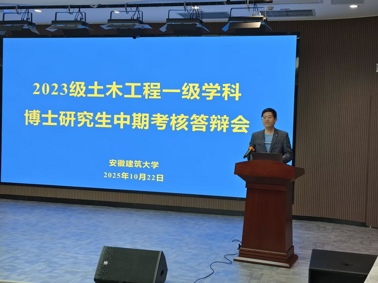 本网讯 为进一步加强博士研究生培养过程管理,确保博士研究生培养质量,10月22日上午,土木工程学院集中开展了2023级土木工程一级学科博士研究生中期考核答辩会,答辩会由黄显怀教授担任答辩组长,同时邀请了中国科学技术大学梁海弋教授和合肥工业大学种迅教授担任答辩委员。校党委常委、副校长杨科出席会议并讲话,土木工程学院院长张宁主持会议,研究生院、土木工程学院、建筑与规划学院、环境与能源工程学院、电子与信息工程学院、材料与化学工程学院等相关单位负责人、博士生导师以及2024级和2025级全体博士研究生参加了答辩会。