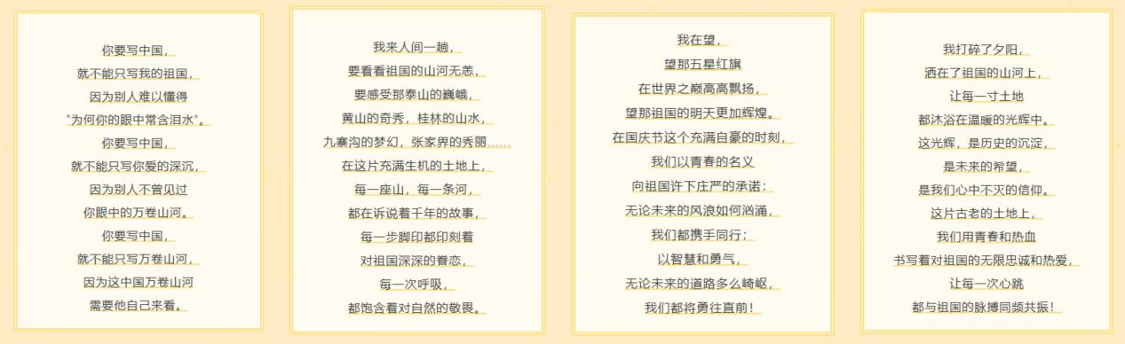 山河锦绣,青春如歌。在这场文字与光影交织的盛宴中,土木工程学院的学子们以笔为剑、以梦为马,用最炽热的情感向祖国母亲献上了一份独特的生日礼物。(文/图:李婉琳、土木学院学生;一审:叶训;二审:马智鑫;三审:王媛)