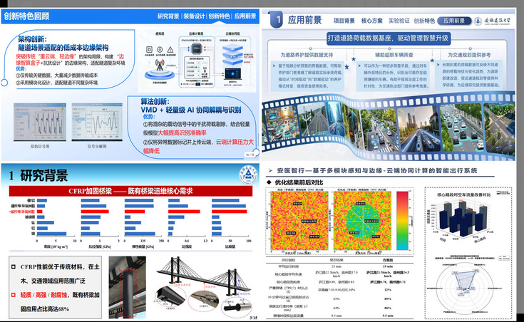 其中,刘胜健同学主持完成的《安医智行——基于多模块感知与边缘-云端协同计算的智能出行系统》荣获一等奖;张国庆同学主持完成的《车-振-声协同赋能:CFRP加固桥梁隐疾的智能声振可视化》与钱瑞同学主持完成的《天使之眼——面向夜间会车安全的智能光照自适应系统》荣获二等奖;朱洵同学主持完成的《基于VMD边缘计算的隧道结构健康感知智慧系统设计研发》、戚晓雨同学主持完成的《基于视频识别技术的交通荷载检测与道路养护系统研究》及孙欣阳同学主持完成的《创芯智造——基于百度飞桨的AIoT物流运输智能车》荣获三等奖。