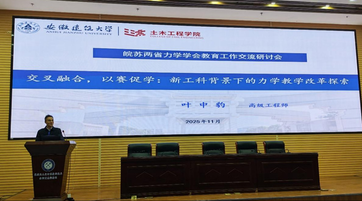 本网讯 11月28日至30日,皖苏两省力学学会教育工作交流研讨会暨2025年年会在淮南顺利召开,本次会议由江苏省力学学会、安徽省力学学会主办,安徽理工大学承办,共有来自安徽、江苏两省40余所高校近90名代表参加会议。工程力学教研室党支部党员教师叶中豹、戴云彤参加了会议。