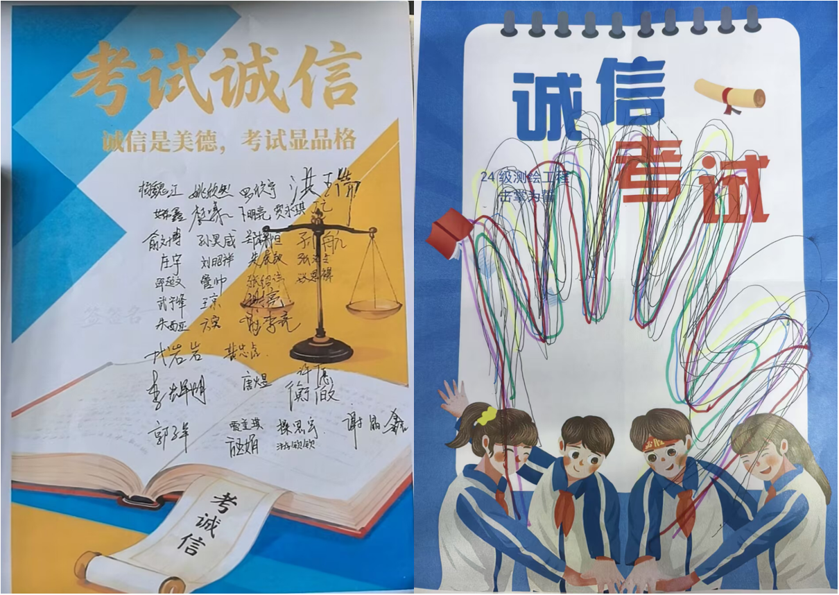 创意海报传诚音集体签名筑信墙为创新活动开展形式,提高学生积极性,有的班级组织开展了“诚信考试”主题海报设计签名活动。学生们充分发挥创意,将校训精神、校园地标与诚信元素相融合,创作了一批兼具思想性与艺术性的作品。24测绘班级通过设计“击掌为誓”主题海报并集体画下手印的仪式,将诚信诺言化为可视的青春印记,以实际行动彰显了诚实守信的决心。