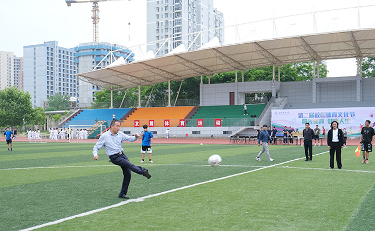 表演结束后,闵杰兴致勃勃为足球俱乐部比赛开球。安徽建筑大学第二届校园体育文化节正式拉开帷幕。