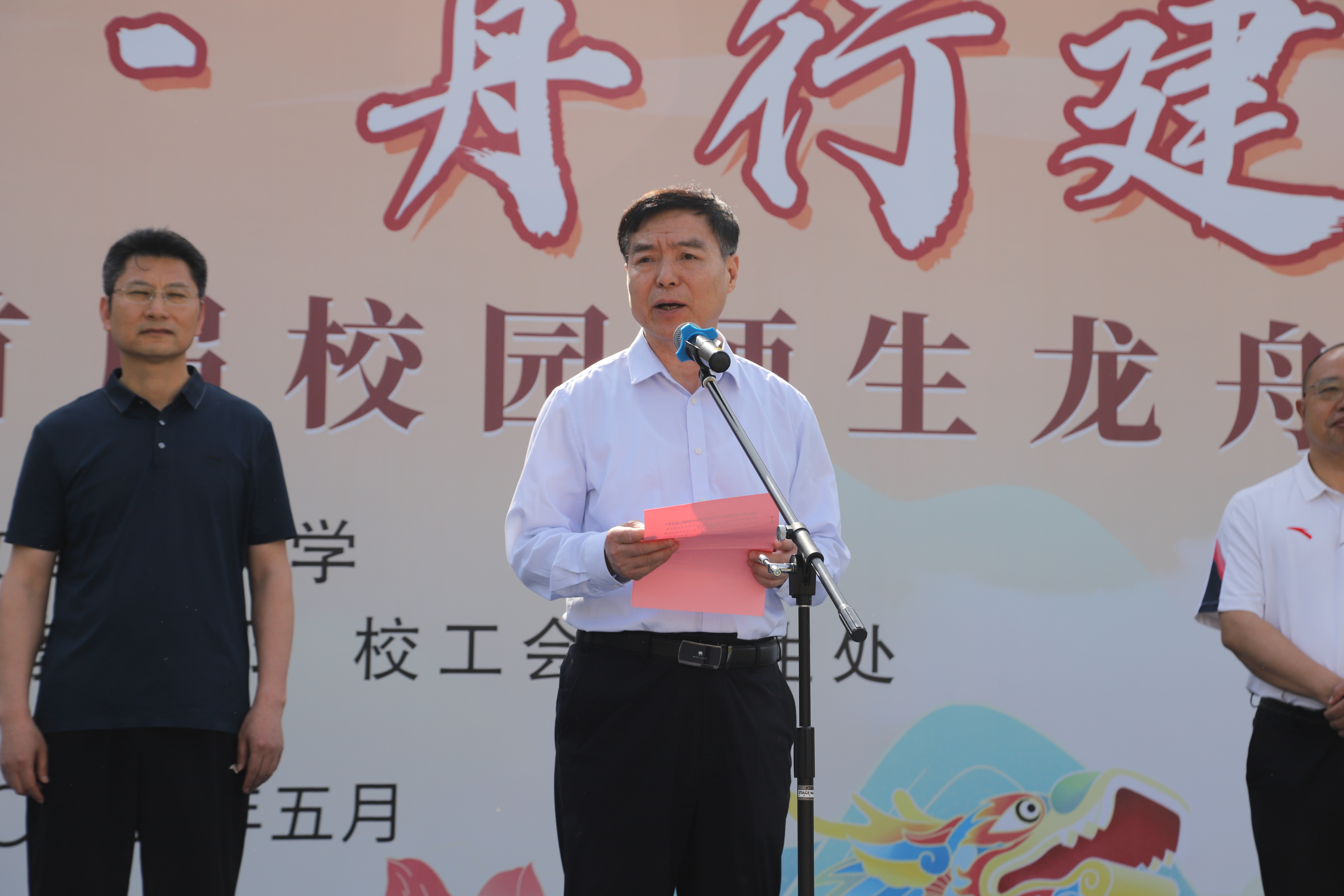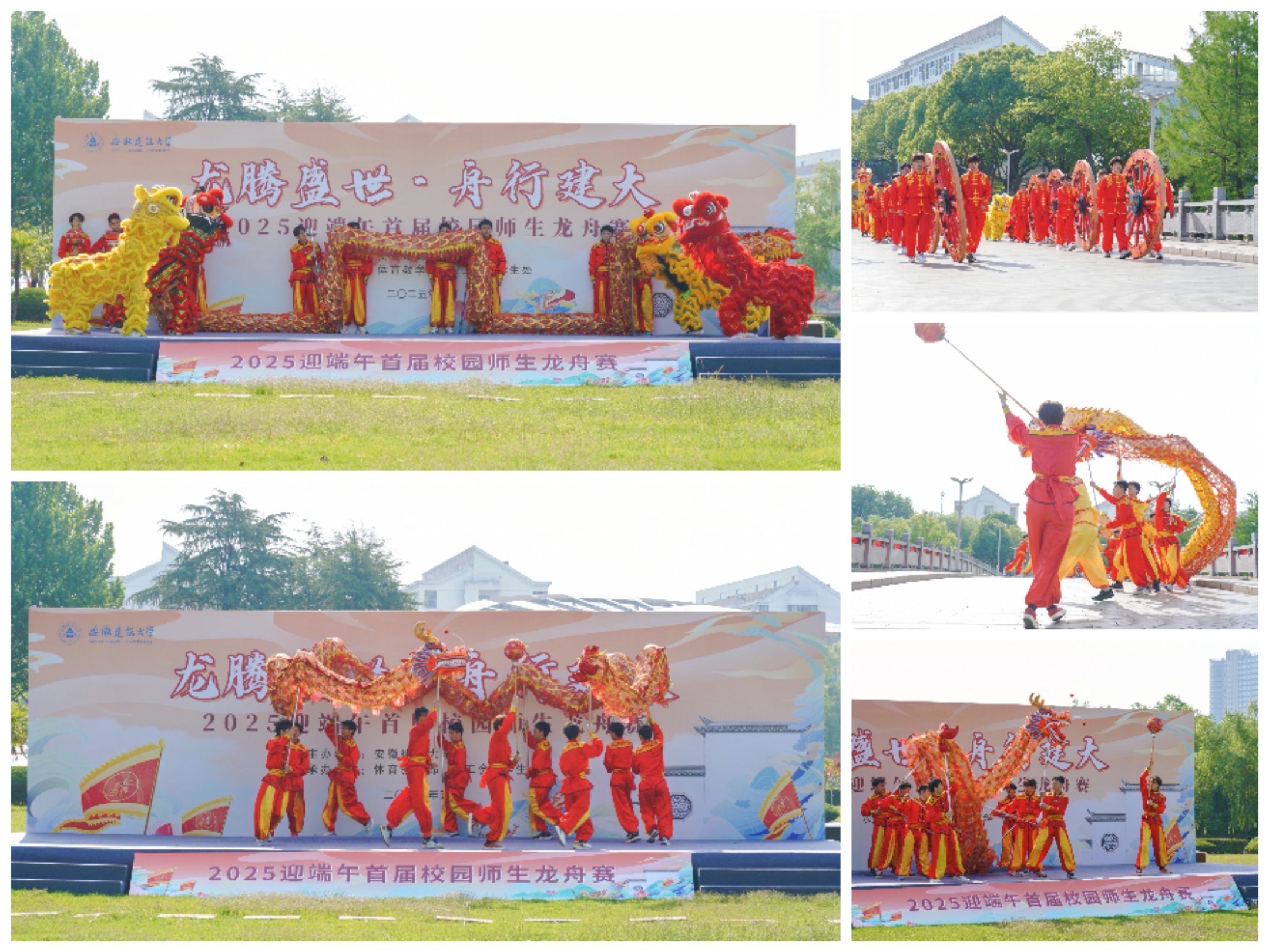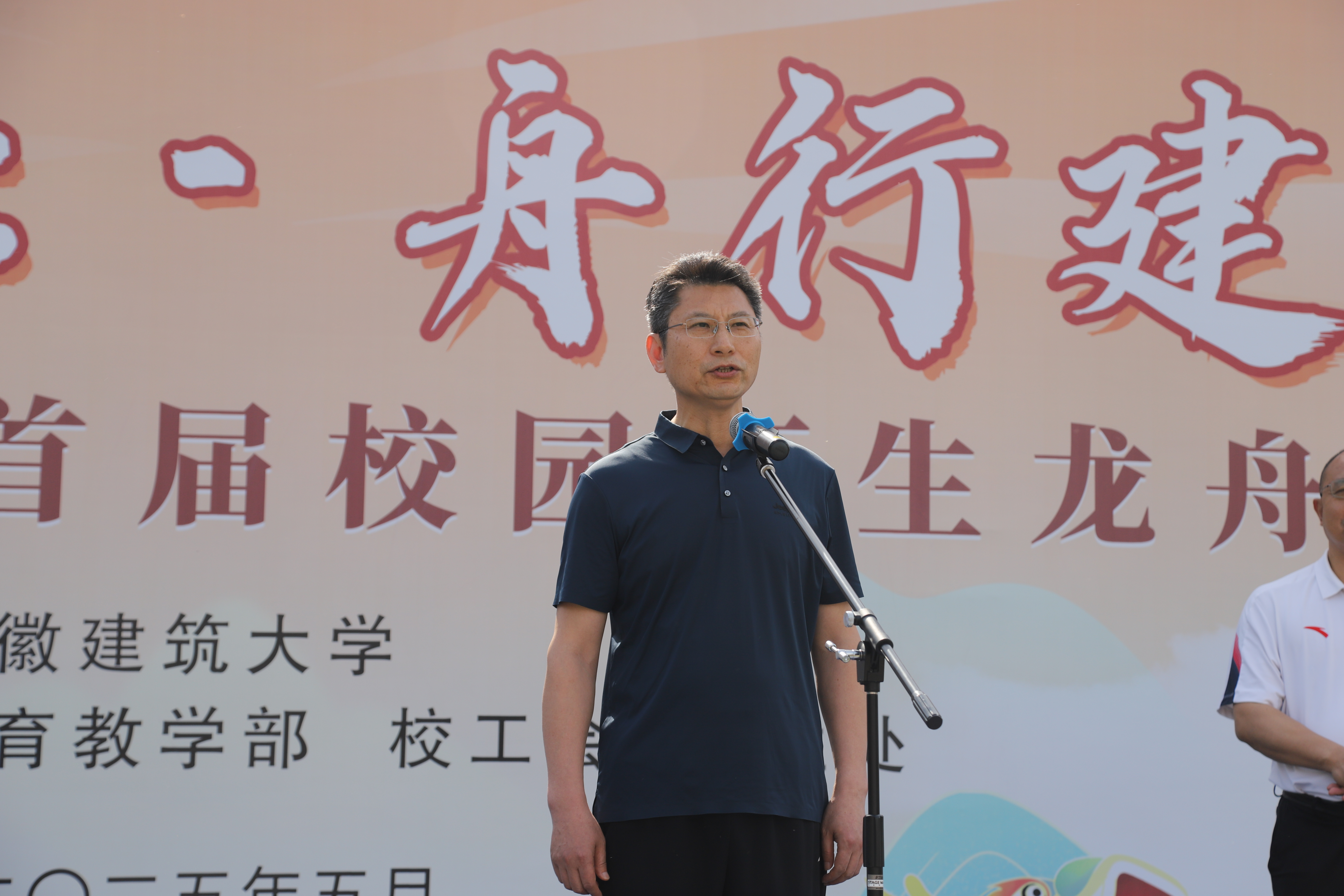 本网讯5月17日上午,紫云路校区易海湖畔鼓声震天、浪花激扬,由体育教学部、校工会、学生处联合承办的“龙腾盛世•舟行建大——2025迎端午首届校园师生龙舟赛”在此顺利举行。校党委书记马文革、校党委副书记、校长黄显怀、校党委常委、副校长李早出席开幕式,安徽省教育厅体卫艺处处长葛德连、安徽职业技术学院党委书记李方泽作为嘉宾应邀出席。