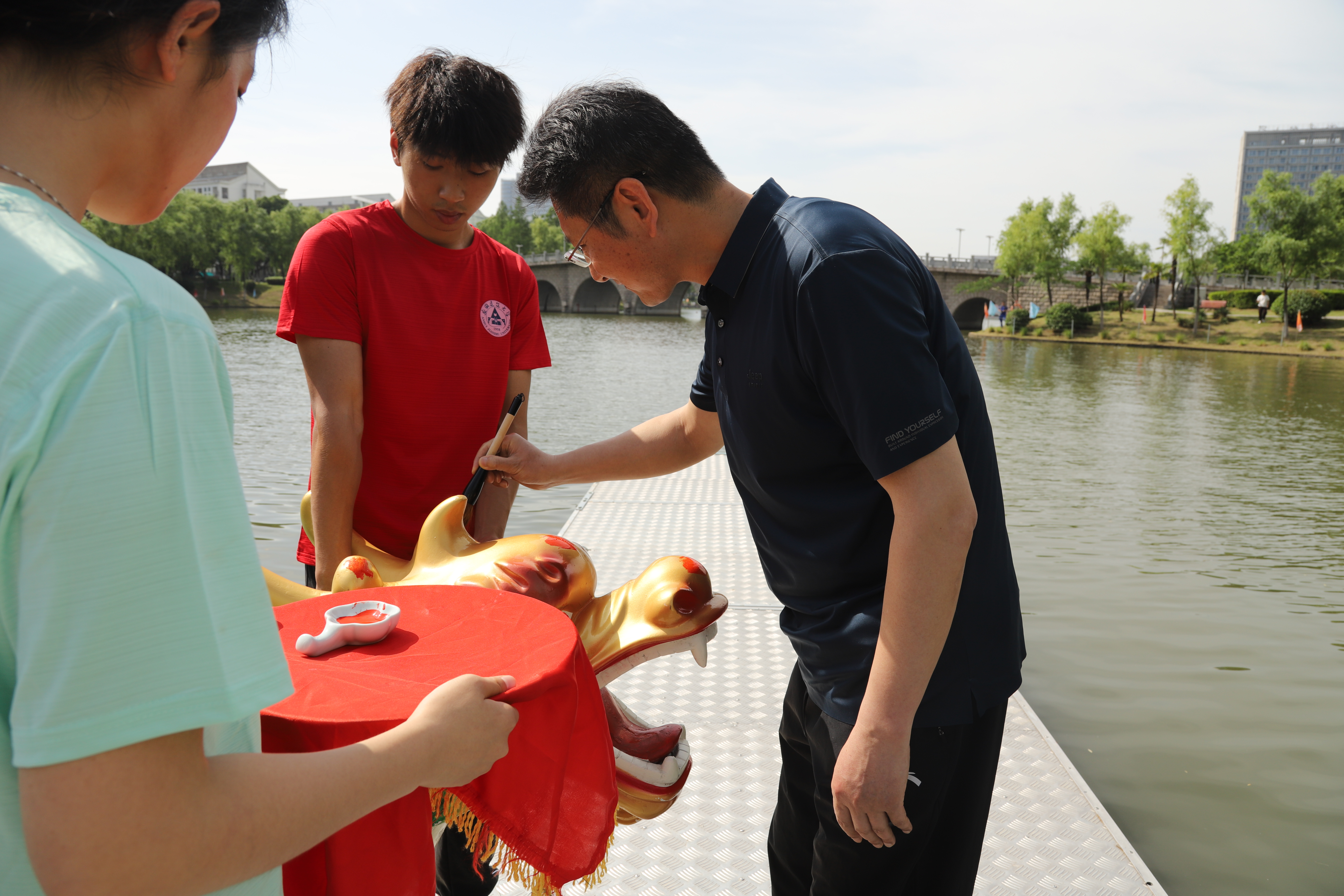 接着,校领导与嘉宾移步龙舟码头,手持朱砂笔为龙舟点睛。“一点眼睛,风调雨顺;二点天庭,吉星高照!”,伴随主持人的声声祝祷,一笔笔朱砂不仅是对龙舟的祝福,更是对所有参赛师生勇往直前、劈波斩浪的期许!