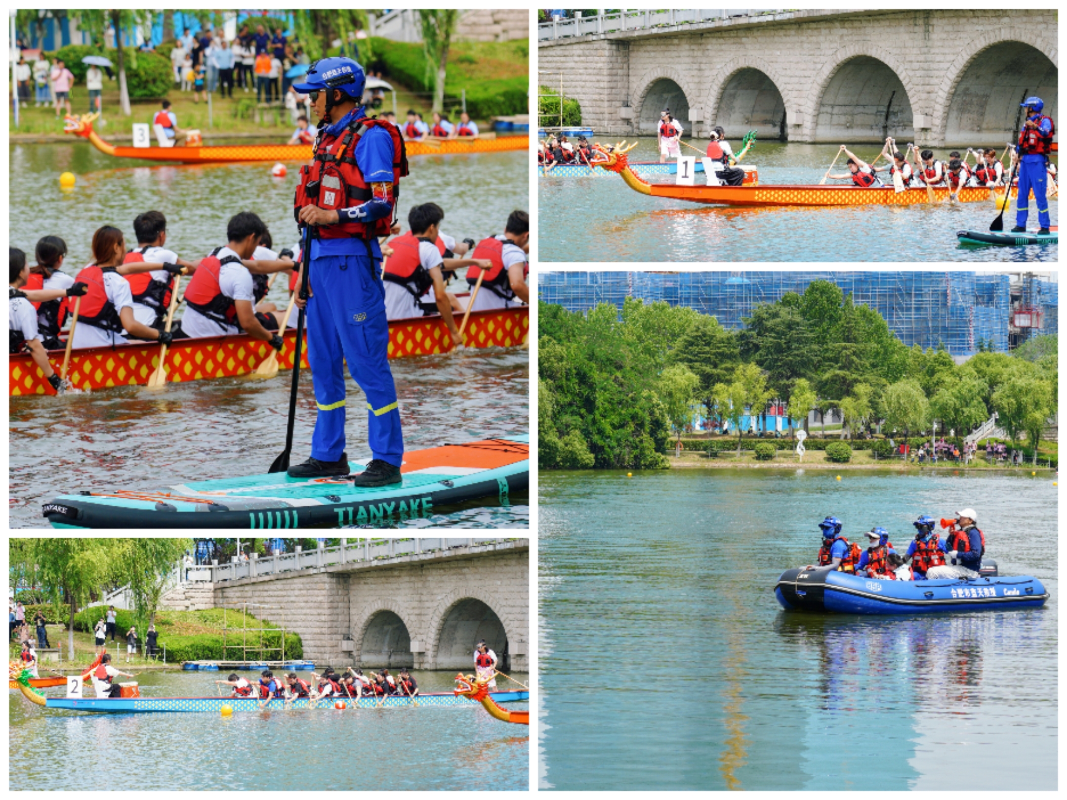 龙舟竞渡扬斗志,百舸争流展风采。仪式结束后,两支华美的龙舟如离弦之箭划破水面,在湖面留下道道银练,为正式比赛拉开华丽序幕。在200米直道赛中,各参赛队伍如离弦之箭,在易海湖面飞驰而出,他们你追我赶,互不相让,一时间,湖面上龙舟竞渡,蔚为壮观。船头的鼓手有节奏地敲击着大鼓,激昂的鼓点声仿佛是冲锋的号角,激励着队员们奋勇向前;船上的划手们整齐划一地挥动着船桨,动作刚劲有力,桨叶划开水面,溅起层层白色的浪花;船尾的舵手则全神贯注地掌控着方向,确保龙舟沿着既定的航道快速前行。在激烈的拔河比赛中,各支队伍都展现出了顽强的拼搏精神和出色的团队协作能力,他们手中的船桨齐刷刷地划入水中,溅起巨大的水花,汗水与湖水交织,观众呐喊声一浪高过一浪。