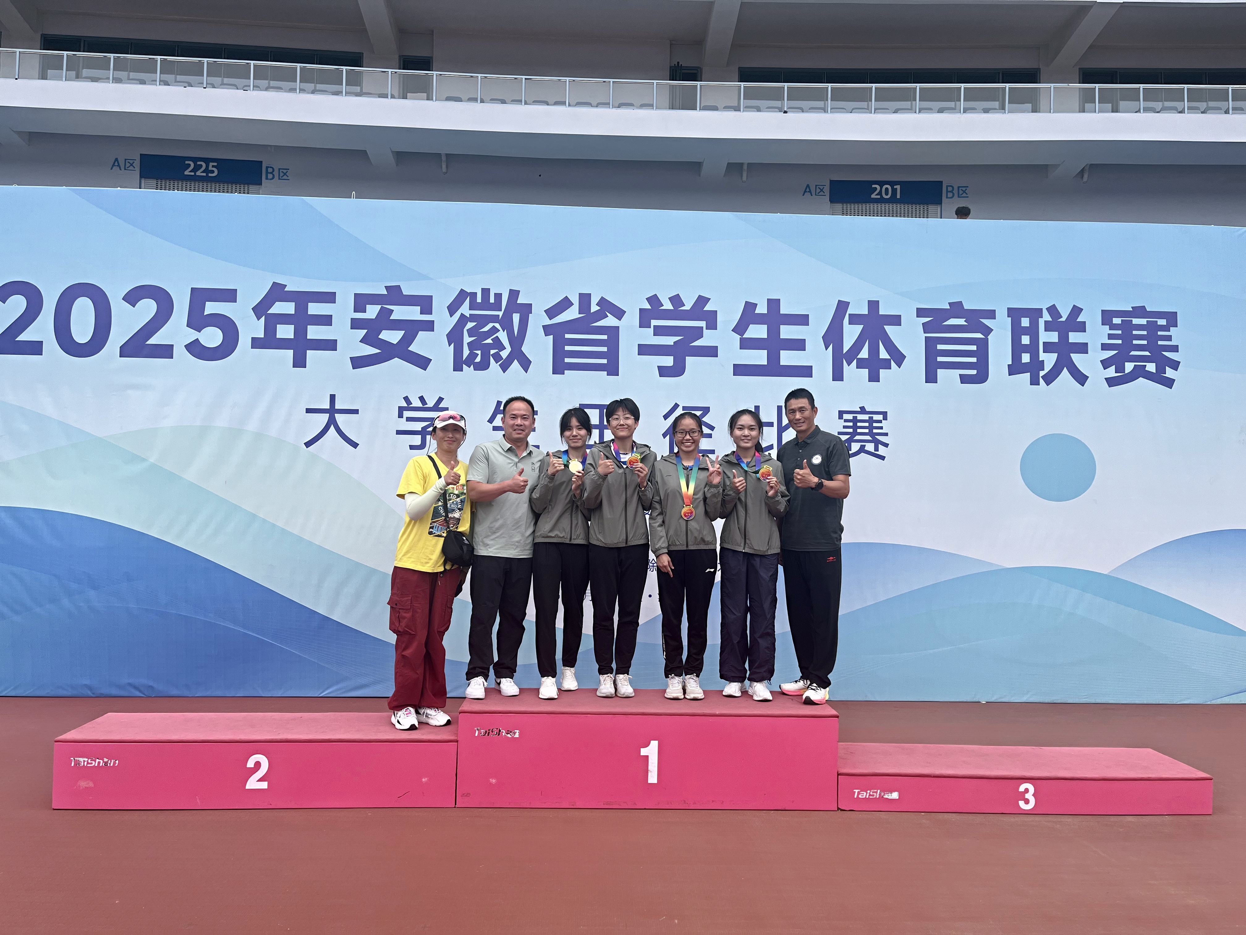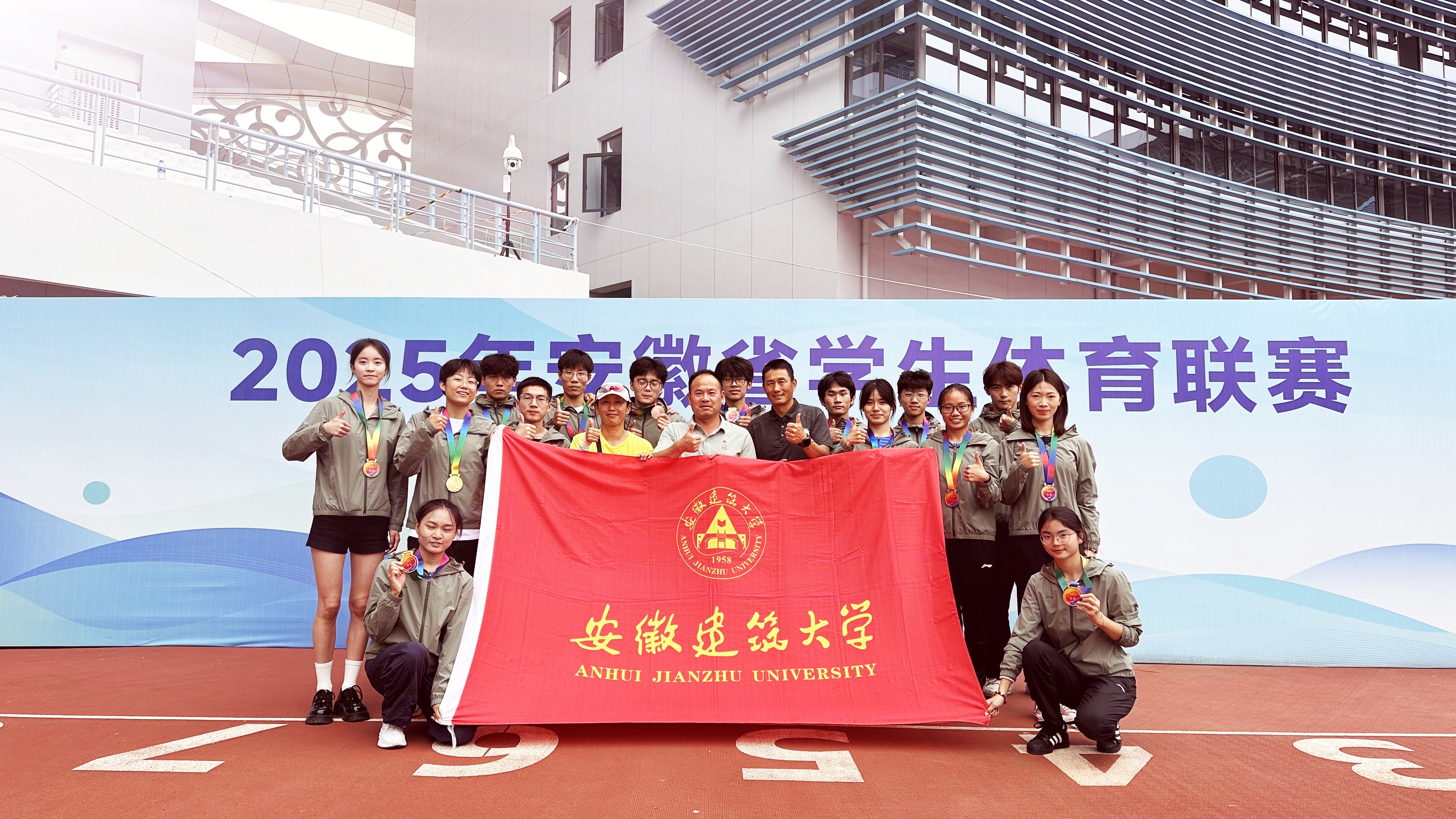 本网讯5月27日,安徽省学生体育联赛大学生田径比赛在滁州市奥体中心圆满闭幕。本届赛事由安徽省教育厅、安徽省体育局联合主办,吸引了全省87所高校1025名运动员参赛。我校田径队15名运动健儿以卓越表现斩获3枚金牌、4枚银牌、2枚铜牌,并打破1项省纪录,最终以团体总分第三的佳绩续写辉煌。