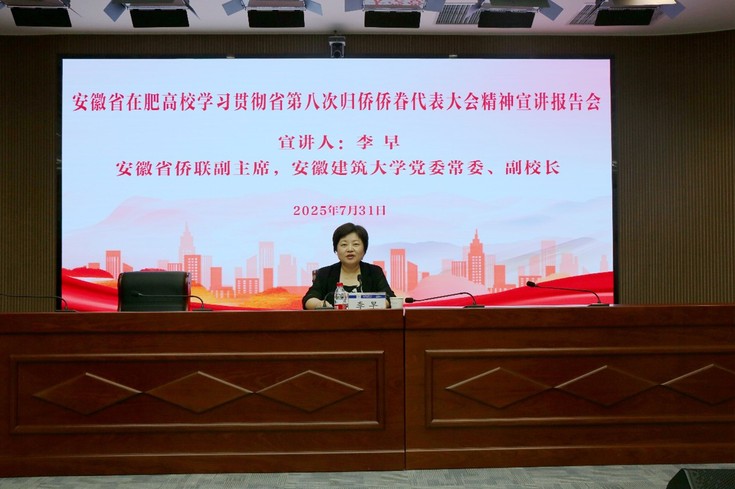 本网讯 为全面学习贯彻安徽省第八次归侨侨眷代表大会精神,推动大会决策部署在全省侨界落地生根,进一步凝聚侨心侨智侨力,团结广大归侨侨眷和海外侨胞奋进新征程、建功新时代,7月31日,安徽省在肥高校学习贯彻省第八次归侨侨眷代表大会精神宣讲报告会在我校徽智楼报告厅举行。会议由安徽省归国华侨联合会主办、安徽建筑大学承办,安徽省侨联副主席、安徽建筑大学党委常委、副校长李早宣讲。省侨联相关部门、在肥高校侨界教师、归侨侨眷代表、侨联工作者参加报告会。