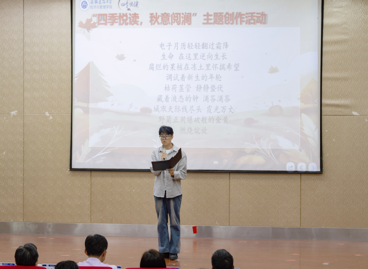 接着,四季主题活动演绎环节启动。在春日篇章中,宁潇琪同学带来经典诗词朗诵,朗朗书声如春日繁花,带领大家领略了古典文学之美,感受了中华文化的博大精深。在夏日篇章,活动介绍了“阅行千里,知行合一”暑期三下乡实践活动及“四季悦读,智享书缘”读书分享会的规划。这些活动通过实践与分享,进一步激发了同学们的阅读兴趣。优秀读书笔记的展示环节中,同学们所获得的深刻思考也得以展现。秋日主题下,马明轩同学分享了其精彩的诗歌创作朗诵,作品《秋日本标馆》捕捉了秋天的斑斓色彩,融入个人情感与思考,展现了对秋天的独特感悟。在冬日的书籍借阅演绎环节中,工作人员与借书学生通过书籍交换的形式,让同学们在寒冬中同样感受到知识传递的温暖,展现了阅读交流的乐趣与重要意义。