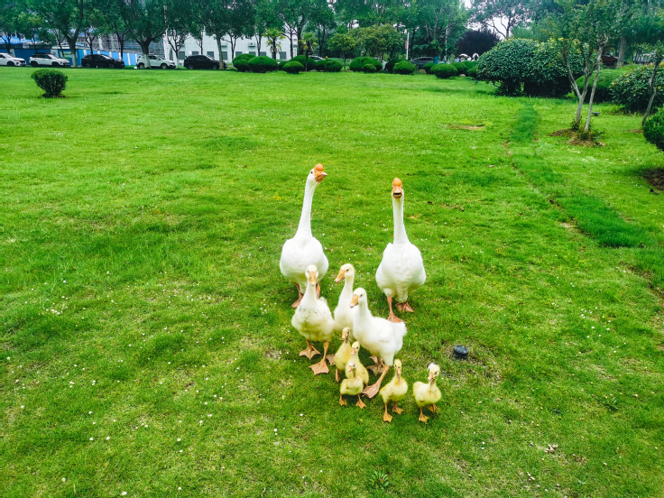 雨后初晴,惠风和畅。在“鹅爸鹅妈”的带领下,大白鹅一家来到湖边遛弯,悠然自得、其乐融融。