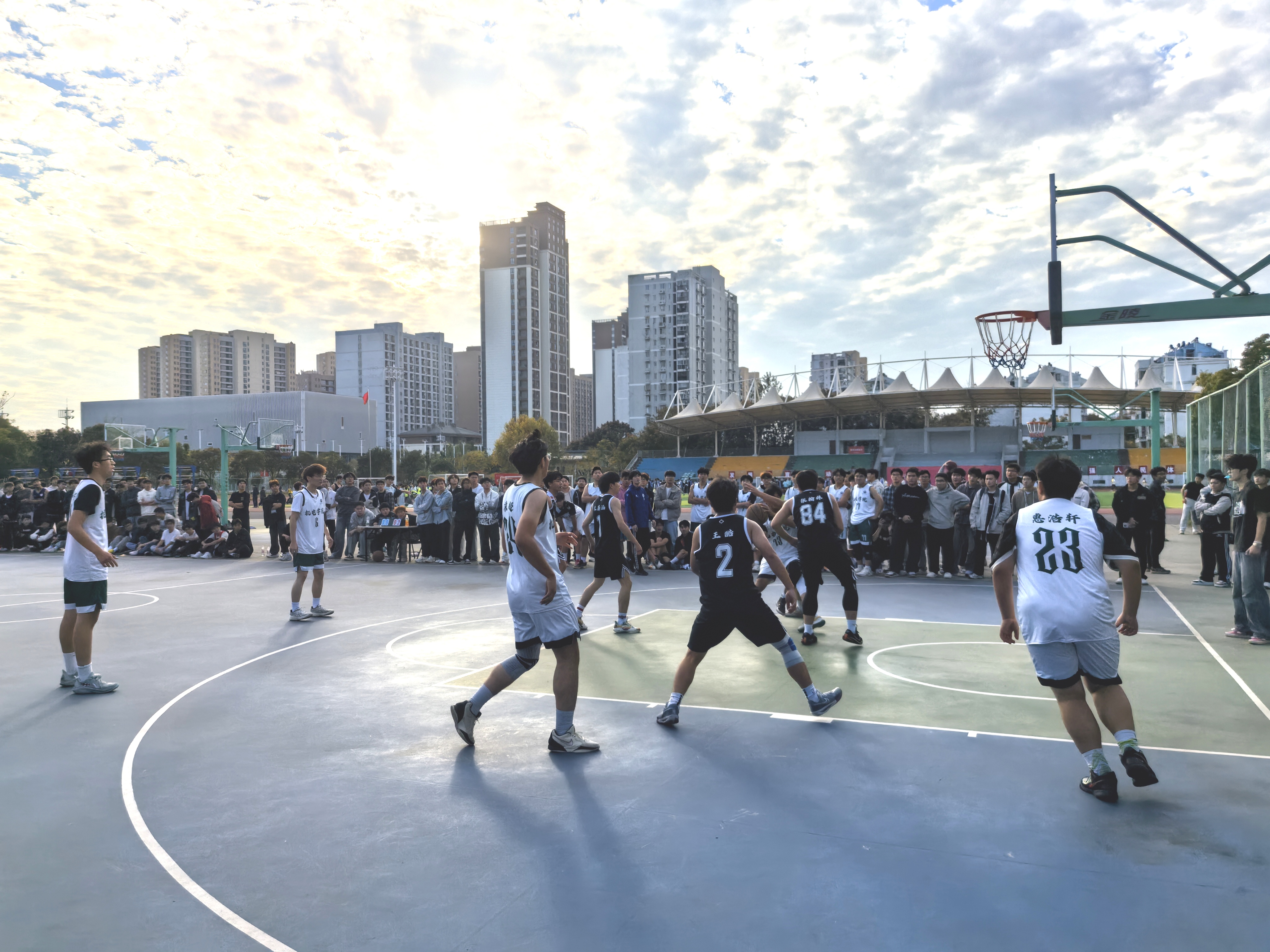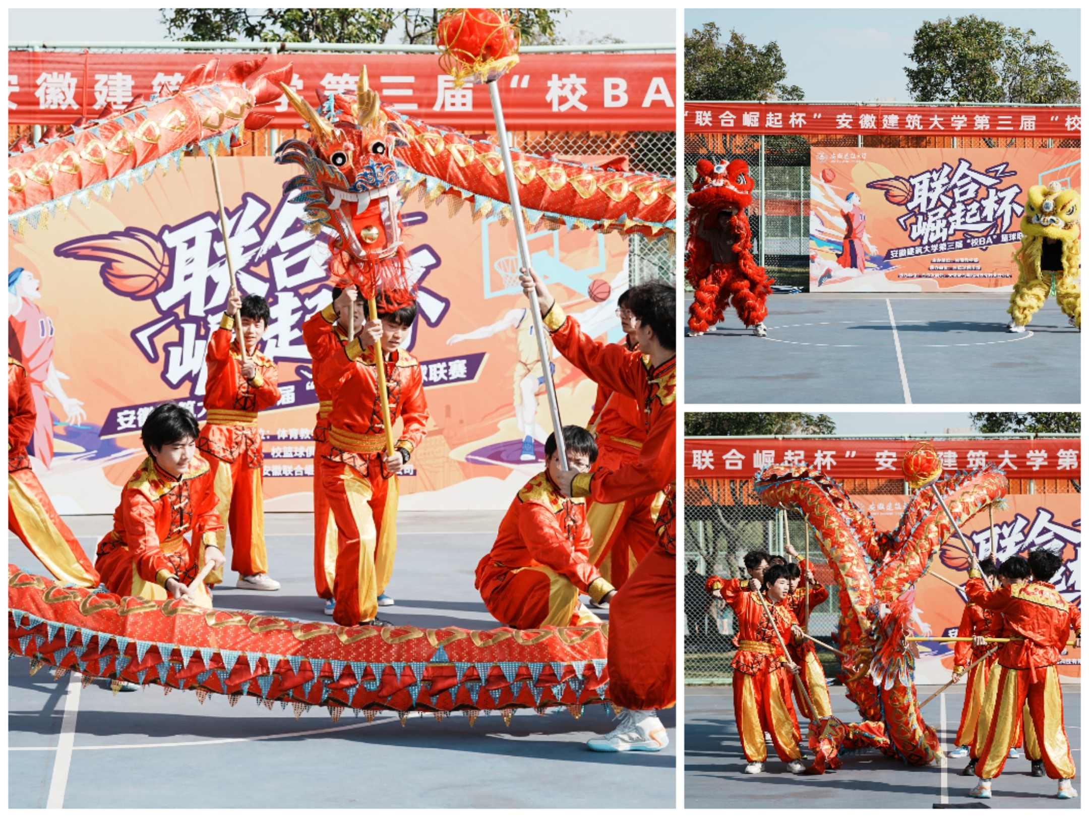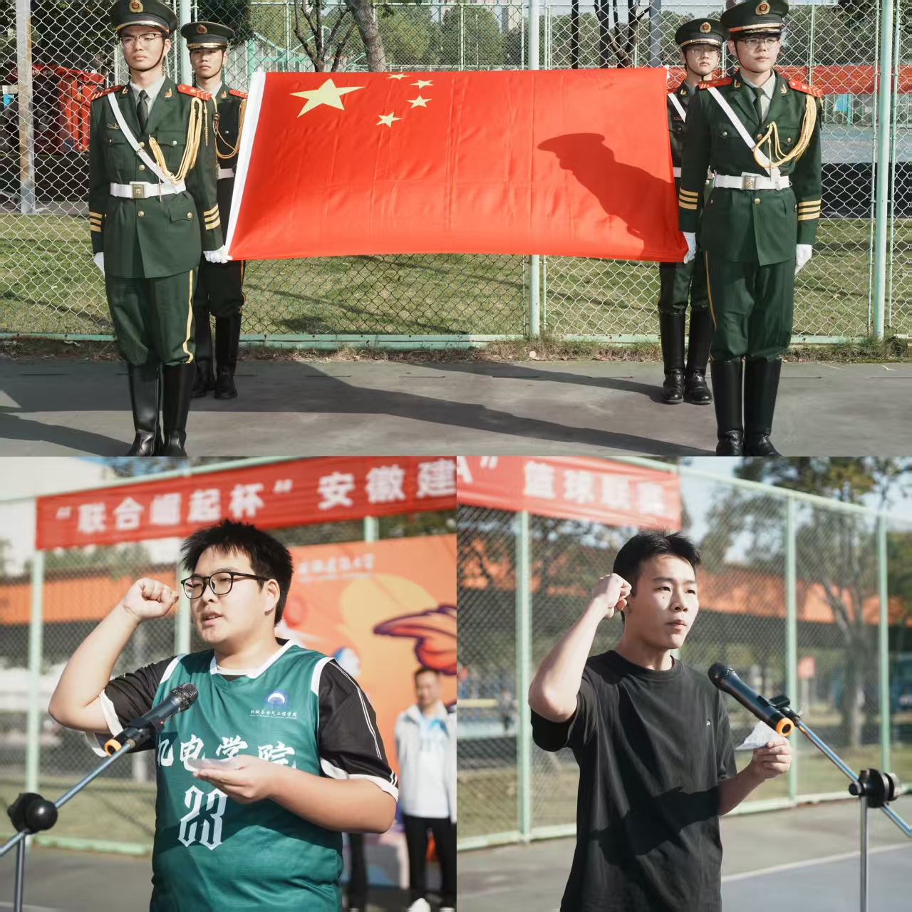 秋高气爽,晴空万里。伴随铿锵鼓点,校舞龙舞狮俱乐部的同学们翻腾跃动,龙须迎风、狮尾生风,为即将打响的篮球联赛点燃火热气氛。国旗班队员步履铿锵,护送五星红旗踏过中场,全场肃立,雄壮的中华人民共和国国歌响起,庄严肃穆,青春的赛场在这一刻与家国同辉。