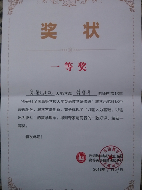 本网讯 7月28-31日,由外研社主办,2013年度全国高等学校大学英语教学研修班教学示范评比在西安举行,由哈工大、中国政法大学等全国40余所院校选拔的100余名优秀选手参加了比赛。经激烈竞争,我系翟宇卉、花娟老师分别荣获一、二等奖。