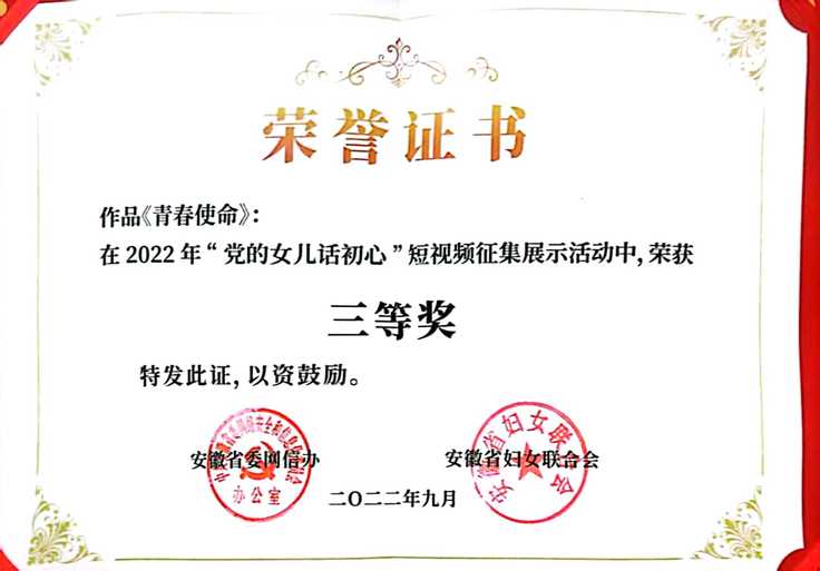 本网讯 近日,由安徽省委网信办、安徽省妇联联合举办的“党的女儿话初心”视频比赛结果揭晓,本次比赛面向全国,共设一等奖1名,二等奖2名,三等奖3名。外国语学院师生创作的视频作品《青春 使命》从近百件参赛作品出脱颖而出,获得三等奖。