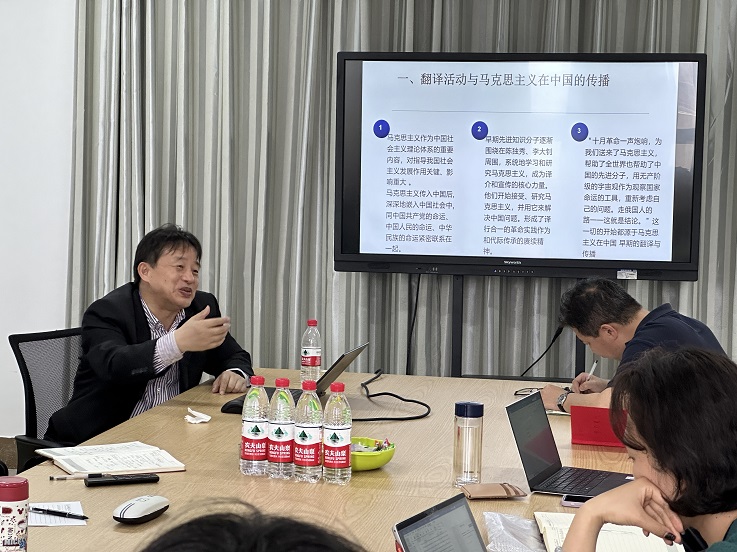 许文胜教授的讲座中以马克思主义在中国传播期间的翻译活动为主题,介绍了早期的中国共产党人如何用世界眼光,深刻洞察当时人类发展的进步潮流,以胸怀天下的情怀寻求马克思主义中国化,作为解决人类面临的共同问题的有效方法。讲座结束后,与会教师还就“翻译史”、“语料库翻译研究”、“ChatGPT与翻译”、“CAT计算机辅助翻译”等相关方面进行提问并展开了热烈的讨论。许文胜教授希望外语教师能够把握人工智能等新技术的发展态势,主动拥抱技术、融入技术,兼备文化素养、爱国情怀和国际视野,用外语讲好中国故事,传播好中国文化。(文/图:张爱萍;审核:余鸿)