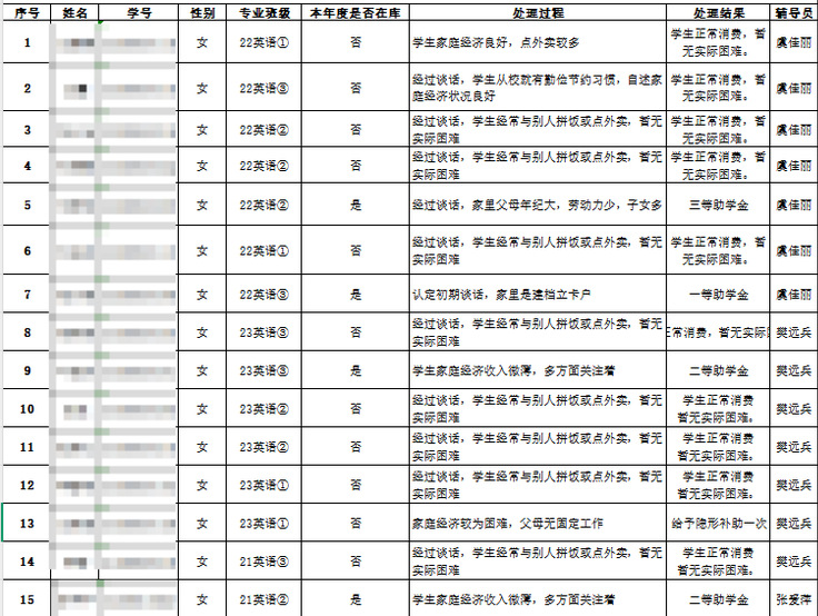 为确保资助工作精准化、规范化,切实做到“应助尽助、不漏一人”,外国语学院提前谋划、主动作为,扎实开展学生家庭经济困难情况精准摸排与“一生一档”建档工作,为后续资助育人工作有序推进奠定坚实数据基础。各年级辅导员通过学生本人提交的《家庭经济困难学生认定申请表》开展初筛,结合学生日常消费、个人谈心谈话、班级评议小组意见等进行排查,梳理出困难学生名单。在此基础上,学院为每一名家庭经济困难学生建立专属档案,档案内容涵盖学生基本信息、家庭详细情况、曾获得资助类型与金额、学业表现、心理状态跟踪等多维度信息,并实行动态管理,由辅导员定期更新学生最新情况,力争实现“一人一策、精准滴灌”,让每一份资助资源都用在刀刃上,切实为困难学生成长保驾护航。