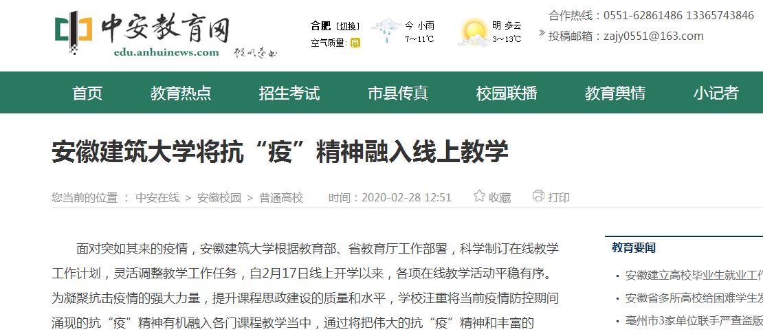 编者按:为凝聚抗击疫情的强大力量,提升课程思政建设的质量和水平,学校注重将当前疫情防控期间涌现的抗“疫”精神有机融入各门课程教学当中,真正助推课程思政教育教学活起来、实起来、动起来。2月28日,中安在线对此进行了报道。