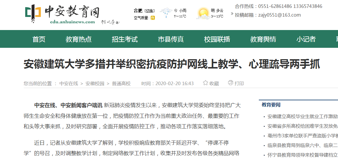 编者按:我校积极响应教育部关于延迟开学、“停课不停学”的号召,及时调整教学计划,制定网络教学工作计划,收集并及时发布各级各类精品网络课程资源和电子图书等信息,指导各教学单位建设网络课程资源,大力推进线上教学资源建设,为按时开展本学期线上教学工作提供有力保障。2月20日,中安在线对此进行了报道。