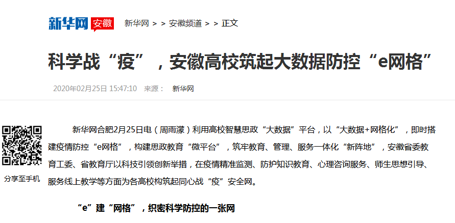 编者按:为“e”同作战,上好战“疫”的思想教育课,我校充分利用易班等线上平台功能,组织辅导员用心培植疫情防控“精神疫苗”。2月25日,新华网安徽对此进行了报道。