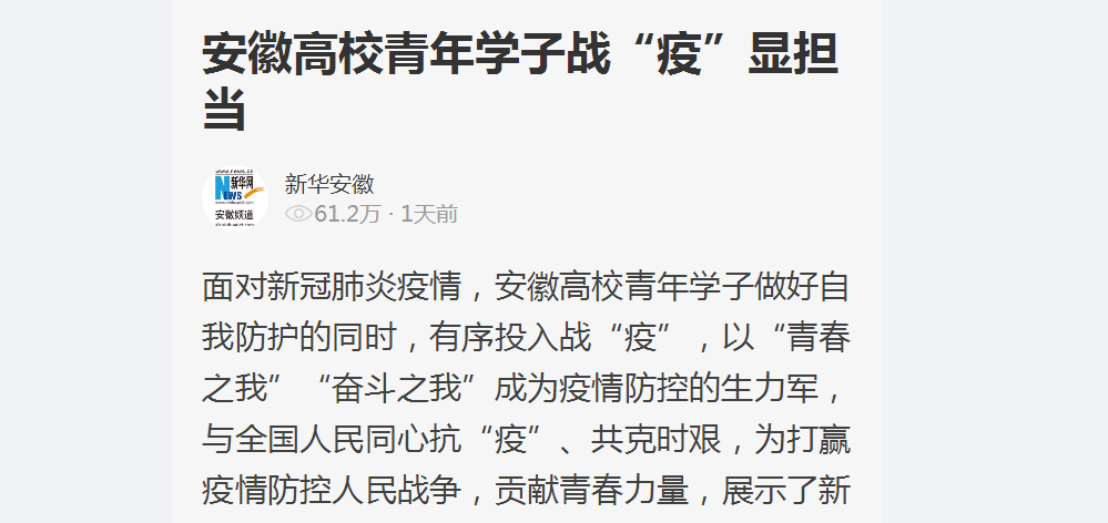 在这场疫情大考中,安徽青年学子赴前线、保后方、精学业、战青春,用“硬核”行动交上了一份属于自己的青春答卷,让人倍感温暖,也让我们对打赢疫情防控阻击战充满信心。(方咏)
