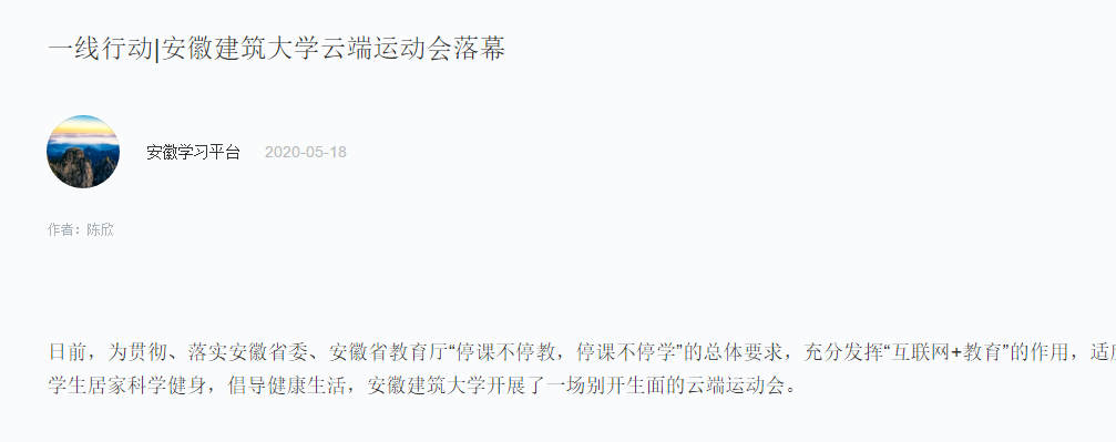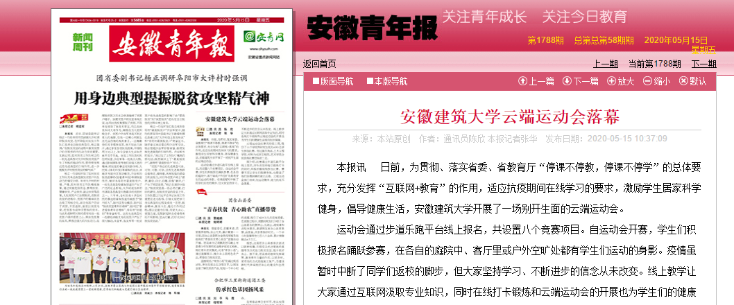 编者按:近日,学校云端运动会圆满落下帷幕。5月15日,安徽青年报头版对此进行了报道,5月18日,学习强国平台进行了转载推介。