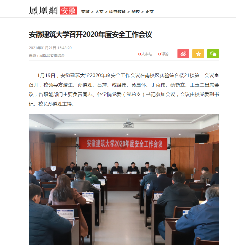 编者按:1月19日,安徽建筑大学2020年度安全工作会议在南校区实验综合楼21楼第一会议室召开,凤凰网安徽对此进行了报道。