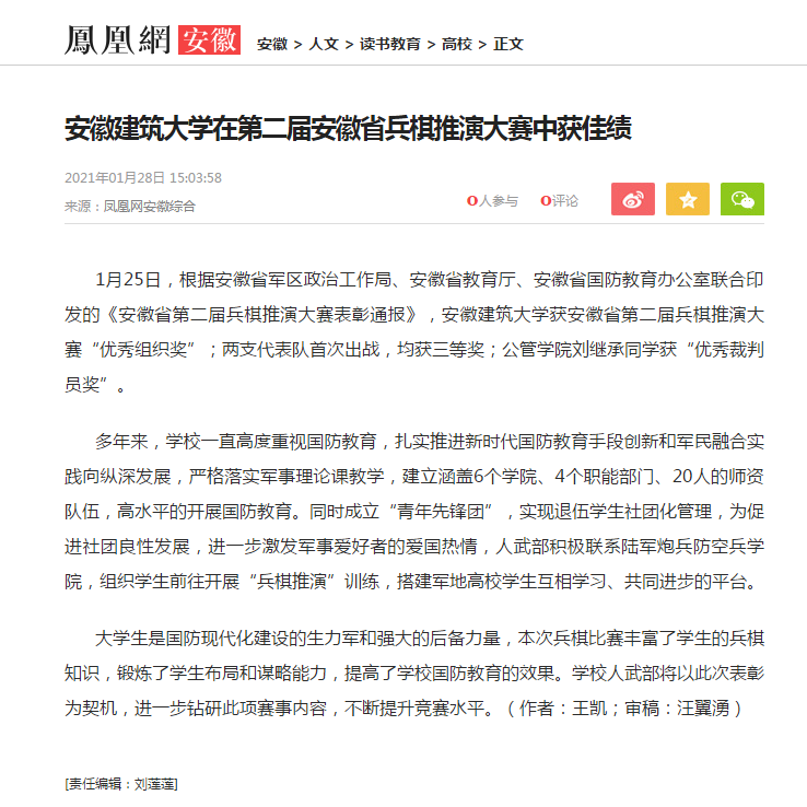 1月25日,根据安徽省军区政治工作局、安徽省教育厅、安徽省国防教育办公室联合印发的《安徽省第二届兵棋推演大赛表彰通报》,安徽建筑大学获安徽省第二届兵棋推演大赛“优秀组织奖”;两支代表队首次出战,均获三等奖;公管学院刘继承同学获“优秀裁判员奖”。