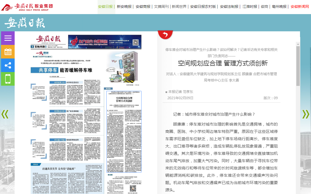 本网讯 停车难会对城市治理产生什么影响?该如何解决?近日,建筑与规划学院规划系教师顾康康接受了安徽日报记者的采访。
