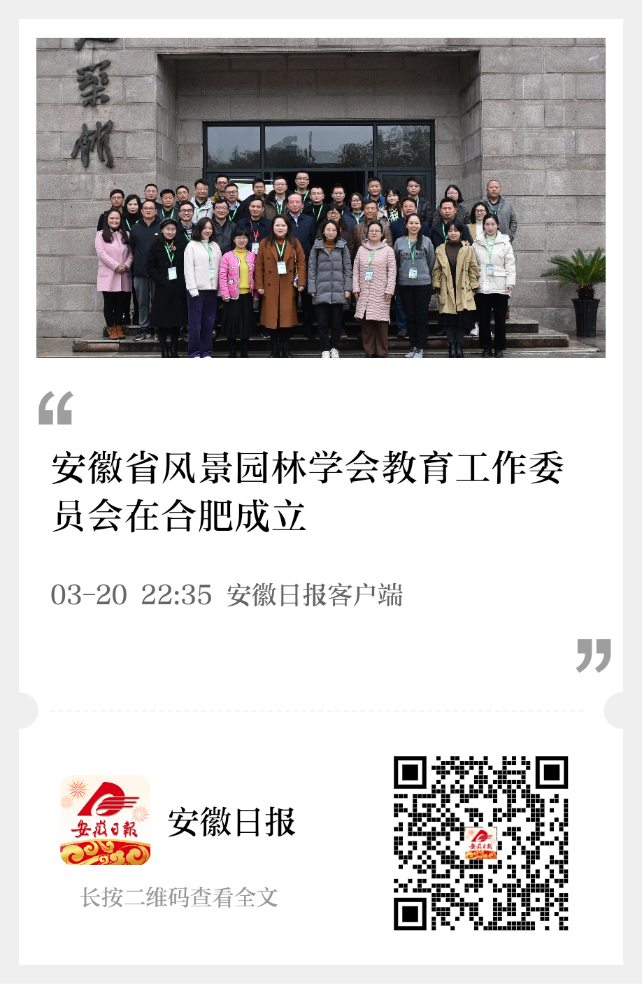 据悉,教育工作委员会是隶属于安徽省风景园林学会的二级机构,挂靠安徽建筑大学。教工委将依托安徽省开设风景园林、园林及相关专业的高等院校的教育、科研资源,搭建全省风景园林教育工作平台,促进风景园林及相关专业的教育教学工作交流,提高风景园林专业人才的培养质量,推动风景园林教育事业健康发展。(文字:李罡,图片:周修远)