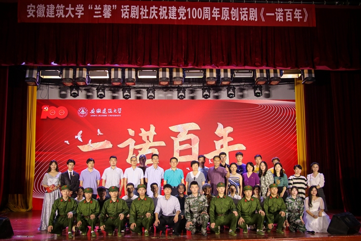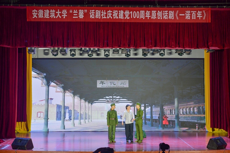 为讲好百年党史的传奇故事,传承红色基因,激发学生们的爱党、爱国之情,充分发挥校园文化在推进大学生党史学习教育中的“精准滴灌”作用,将党史学习教育与落实立德树人根本任务有机结合。安徽建筑大学“兰馨”话剧社历时近8个月编演了话剧《一诺百年》,以抗美援朝老战士禹恨水一家三代,在抗洪救灾、汶川地震、新冠疫情中不忘初心,勇于牺牲,舍小家顾大家为背景。沿着“三代人忠诚守护”的故事主线,在一个多小时的话剧演出中,通过“忠孝两难”“苦盼儿归”“逆行无悔”等一幕幕的动人故事,再现了党和人民解放军坚持以人民的利益为最高利益,践行“为人民服务”诺言的大爱情怀。