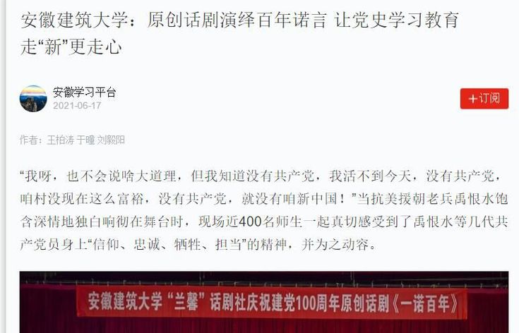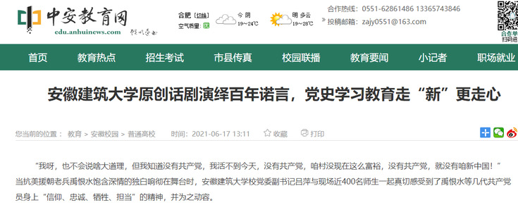 【媒体建大】中安在线 学习强国:安徽建筑大学原创话剧演绎百年诺言,党史学习教育走“新”更走心