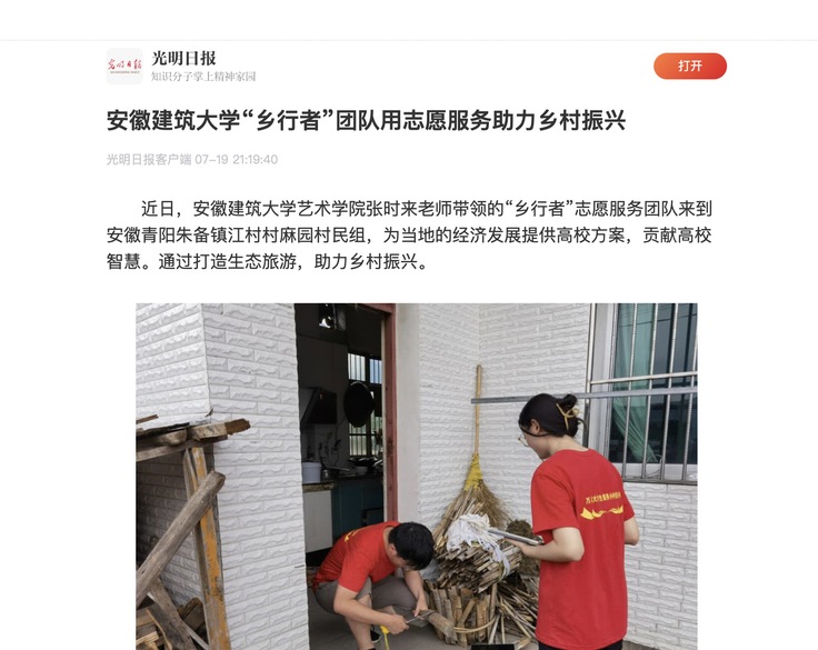 编者按: 近日,我校艺术学院张时来老师带领的“乡行者”志愿服务团队来到安徽青阳朱备镇江村村麻园村民组,通过打造生态旅游,助力乡村振兴,为当地的经济发展提供高校方案,贡献高校智慧。7月19日,光明日报对此进行了报道。