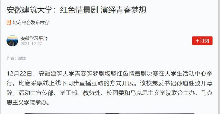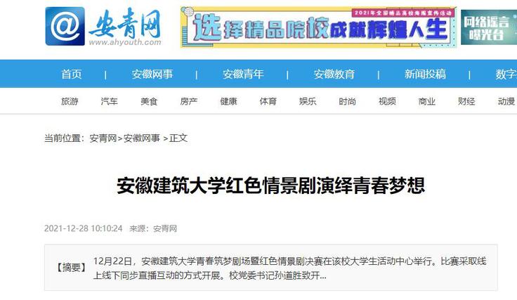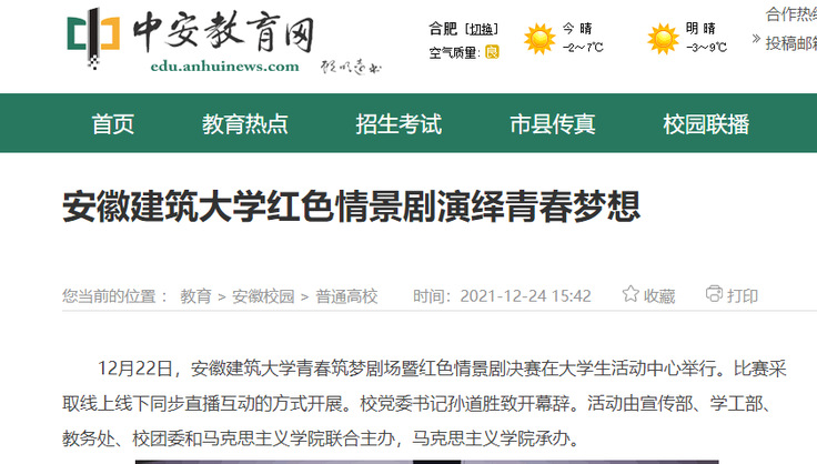 编者按:12月22日,安徽建筑大学青春筑梦剧场暨红色情景剧决赛在大学生活动中心举行。12月24日,中安在线对此进行了报道,12月27日,学习强国平台、安青网对此进行了转载推介。