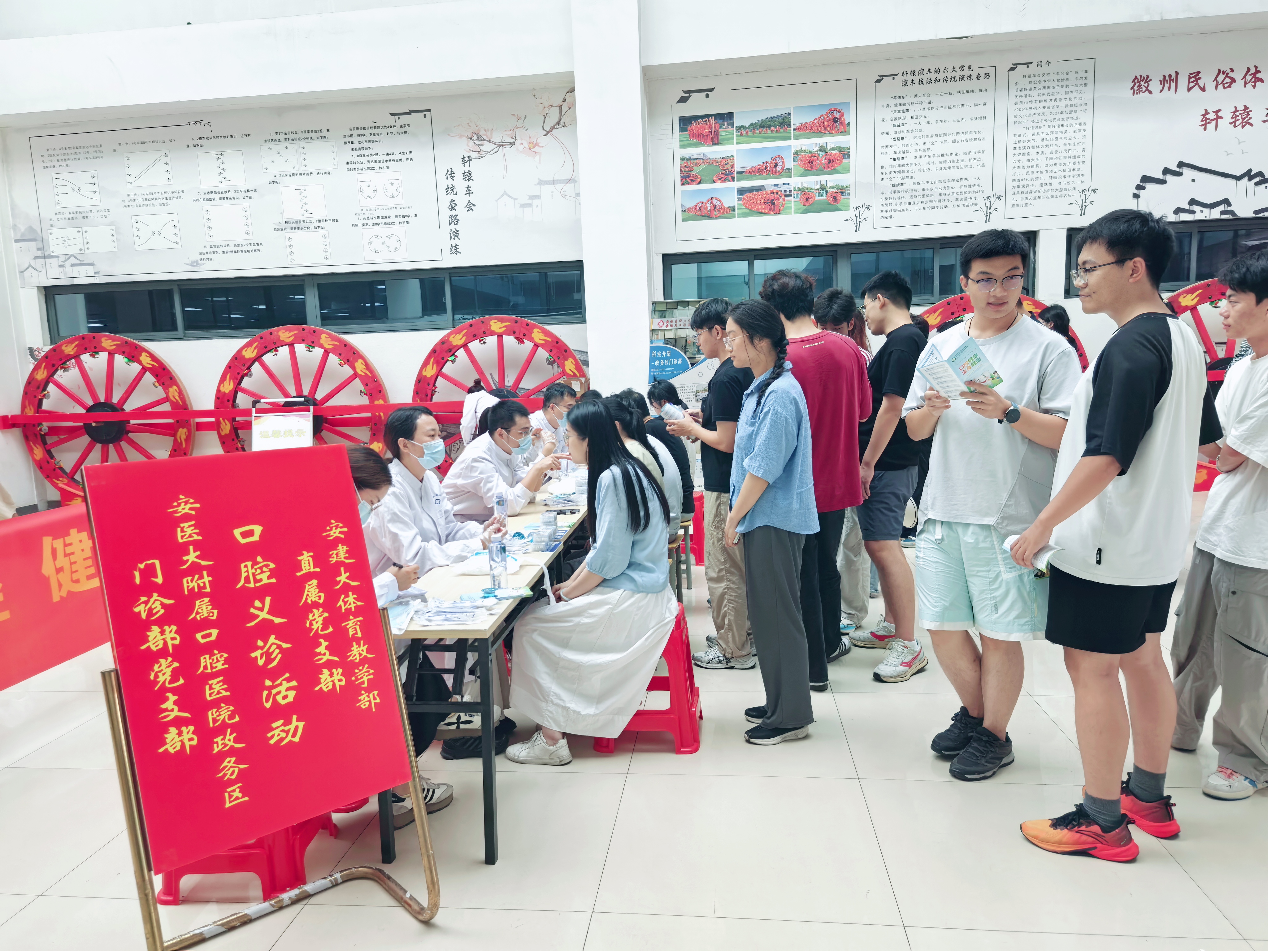本网讯 近日,安徽建筑大学体育教学部直属党支部与安徽省口腔医院政务区门诊部党支部,在安徽建筑大学南区体育馆联合开展党建共建活动,并举办口腔健康义诊,为师生送上专业医疗服务。