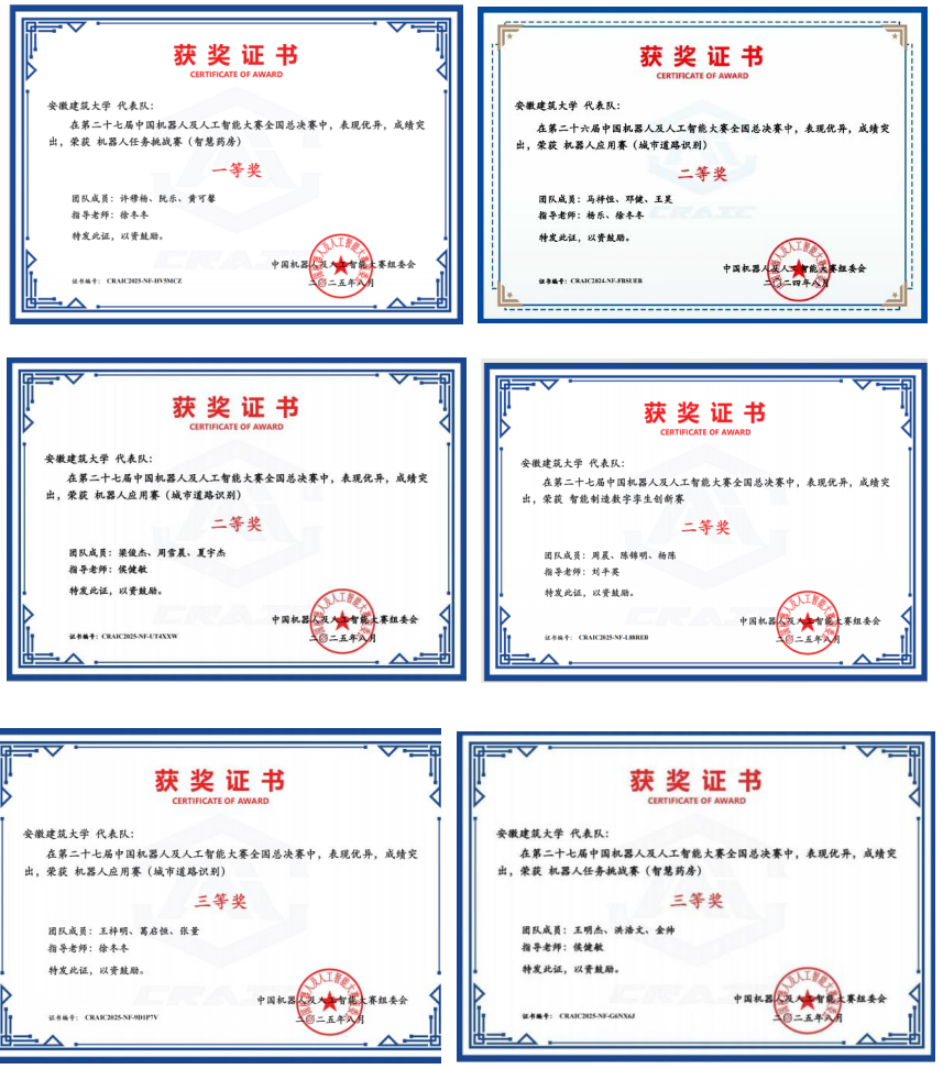 本网讯 近日,由中国人工智能学会主办的2025中国机器人及人工智能大赛全国总决赛圆满落幕。安徽建筑大学-南京信息工程大学联培拔尖班学子凭借扎实的专业能力与顽强的拼搏精神,在赛事中表现突出,最终斩获国家级一等奖1项、二等奖3项、三等奖2项及省级三等奖3项。