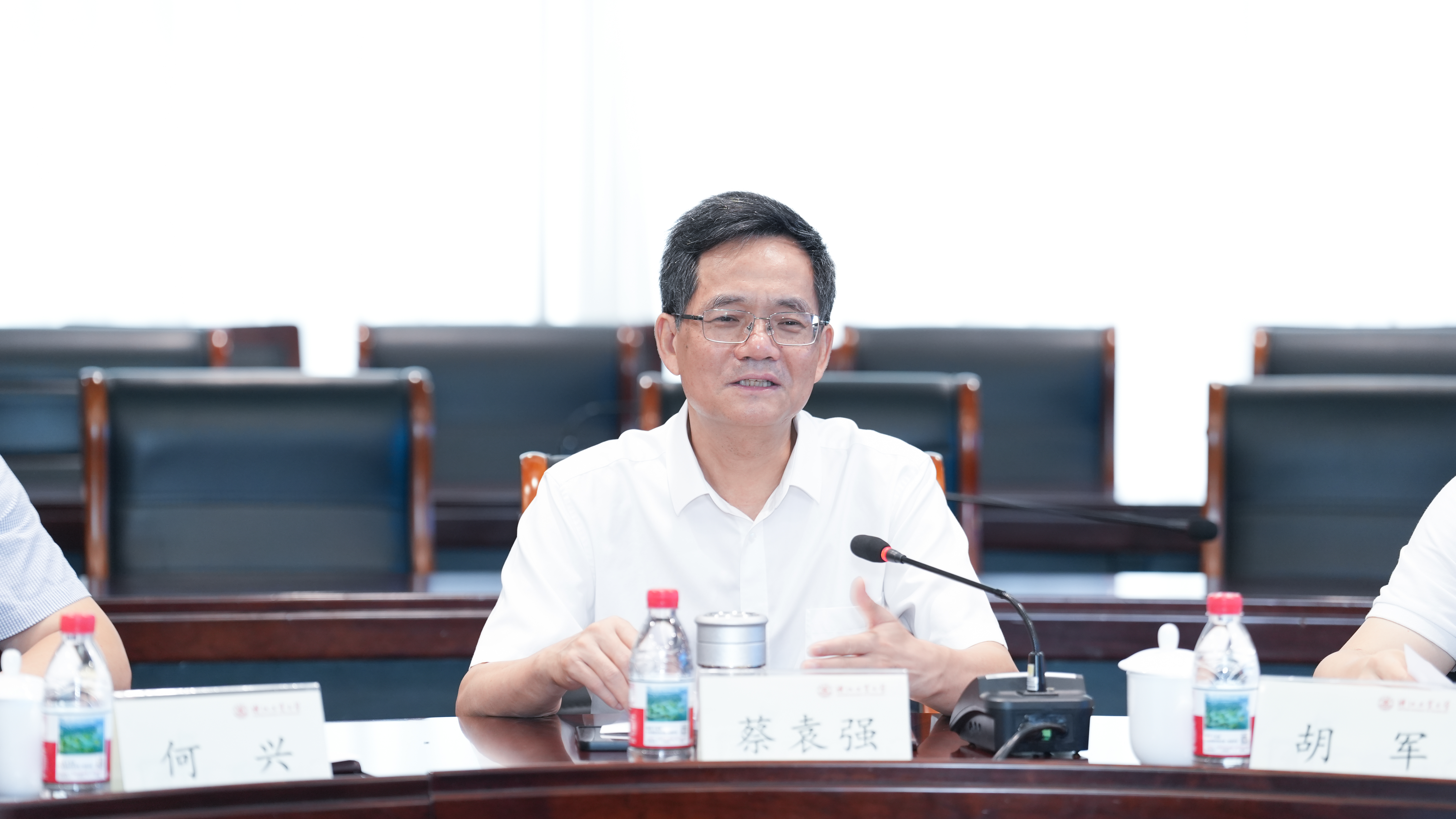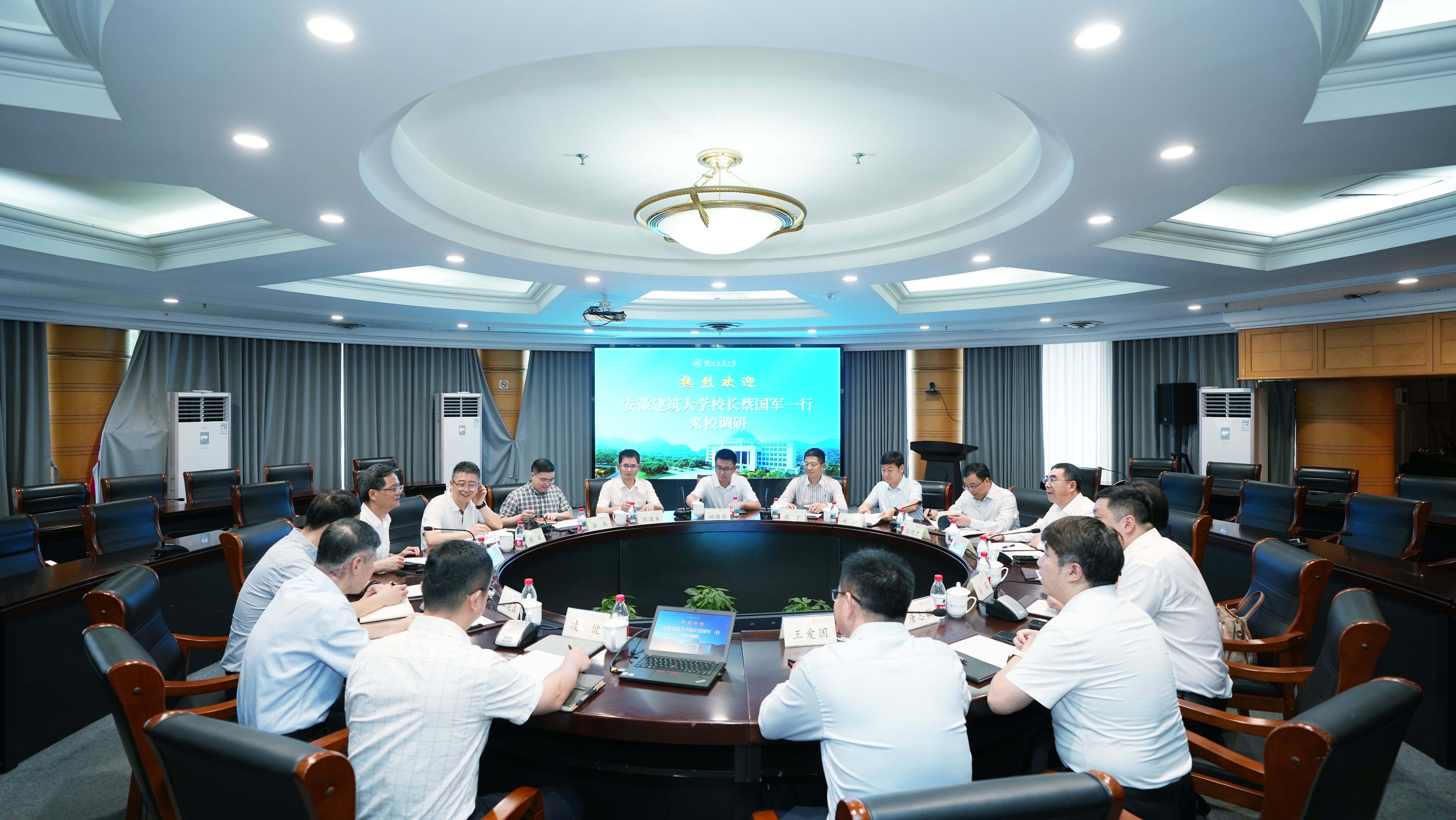 蔡袁强对蔡国军一行的到来表示热烈欢迎,介绍了浙江工业大学的办学情况以及浙工大“以浙江精神办学,与区域发展互动”的发展理念。他指出,浙江工业大学坚持做有组织科研,以服务国家重大战略和区域发展需求为导向,着力构建从基础研究、技术开发到工程应用、成果转化的创新链,在绿色化工、生物制药、先进制造、新能源、新材料、信息技术等领域取得一系列成果。他表示,安徽建筑大学底蕴深厚、特色鲜明。浙工大与安建大在学科结构与发展需求上高度互补,两校各具特色,前期已在多领域取得实质性合作进展,取得良好开端。希望双方以此次交流为契机,进一步发挥各自优势,共享经验、共谋发展,携手服务区域经济社会高质量发展。
