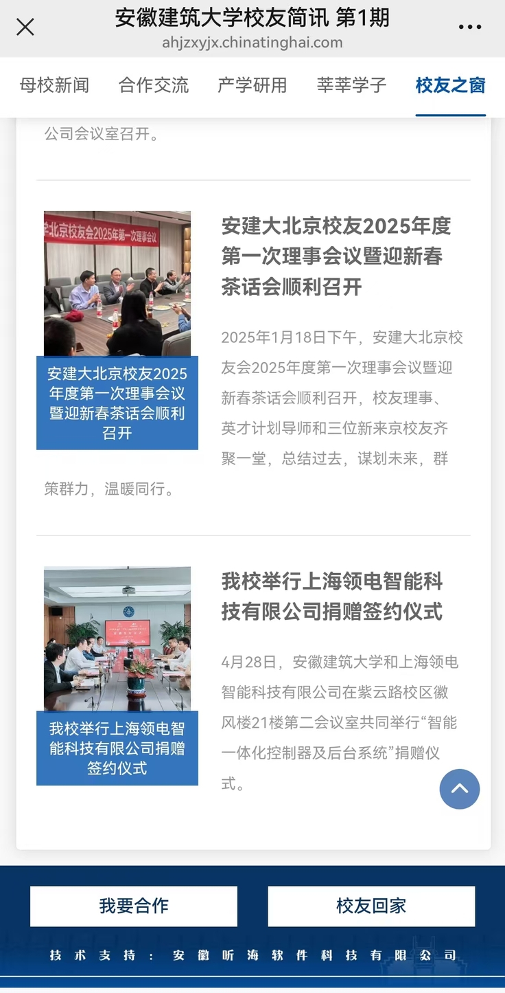 简讯下方,更藏着母校静待归期的热忱。“我要合作” 板块搭建起对外合作沟通交流的桥梁;“校友回家”板块则构架起校友重踏故园,共话当年情的通道。