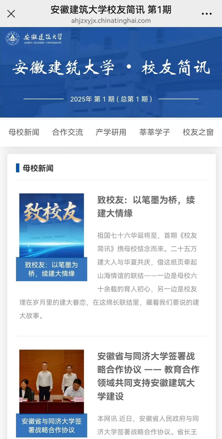校友简讯,源于母校对校友的深情惦念,更旨在构建一个“信息互通、情感互联、发展互促”的精神家园。简讯设有“母校要闻、合作交流、产学研用、莘莘学子、校友之窗”栏目。其中“母校要闻”着眼于建大在高质量发展道路上的坚实步履;“合作交流”展现着母校开放办学的广阔格局;“产学研用”聚焦建大人服务国家战略的责任担当;“莘莘学子”见证后辈传承建大精神的蓬勃朝气;“校友之窗”则搭建了专属于建大人的风采舞台。我们同样诚挚期盼全体校友提笔供稿,让每份牵挂都化作联结彼此的情感纽带。