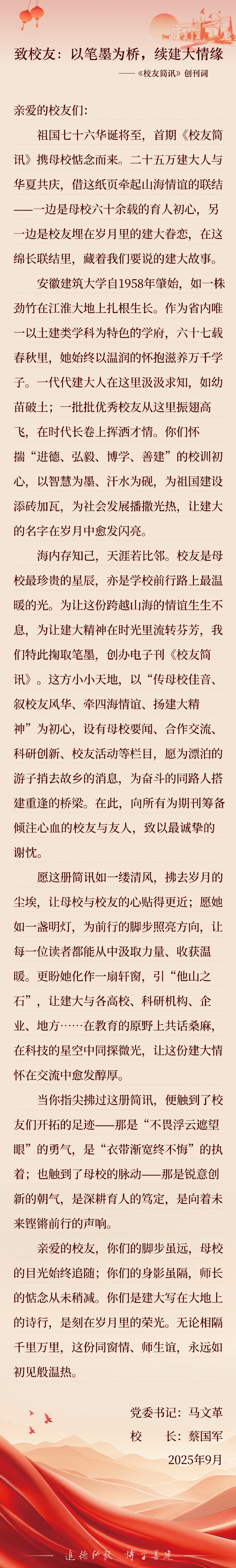 本网讯 金秋送爽,家国同庆。在中华人民共和国成立76周年的喜庆时刻,安徽建筑大学校友简讯电子版如约而至。校党委书记马文革,校党委副书记、校长蔡国军携全体师生,谨以这纸承载思念与荣光的简讯,向海内外每一位建大校友致以最诚挚的节日祝福与深切问候。