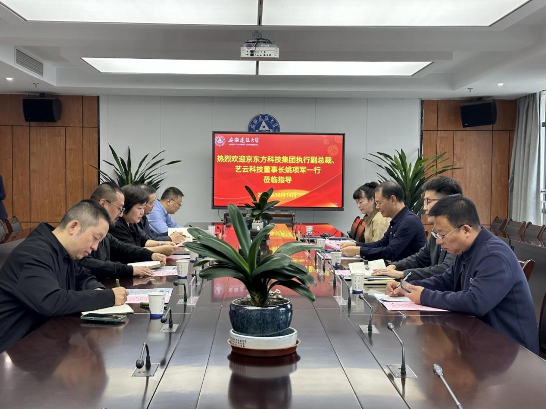 本网讯 10月14日,安徽建筑大学与京东方艺云科技有限公司(以下简称“艺云科技”)于紫云路校区,围绕进一步深化产教融合,推动校企合作,开展交流座谈。校党委常委、副校长李早,科技成果转化处、科技处、艺术学院相关负责人,京东方科技集团执行副总裁、艺云科技董事长姚项军,艺云科技合肥基地总经理朱晨鸣及有关部门负责人出席。