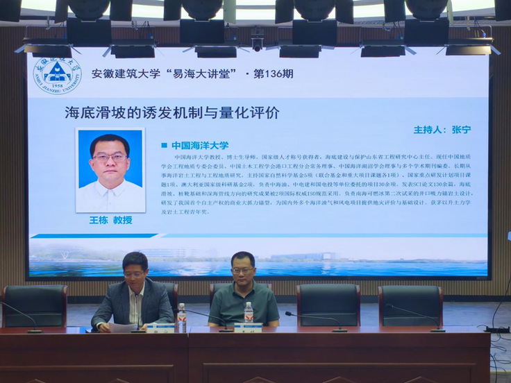本网讯 10月15日下午,由校党委宣传部主办,土木工程学院、安徽省智能地下探测重点实验室承办的第136期“易海大讲堂”在紫云路校区徽智楼一楼报告厅举行。中国海洋大学王栋教授为全校师生做题为《海底滑坡的诱发机制与量化评价》的精彩报告。报告会由土木工程学院院长张宁教授主持,相关专业教师和研究生参加了本次报告会。