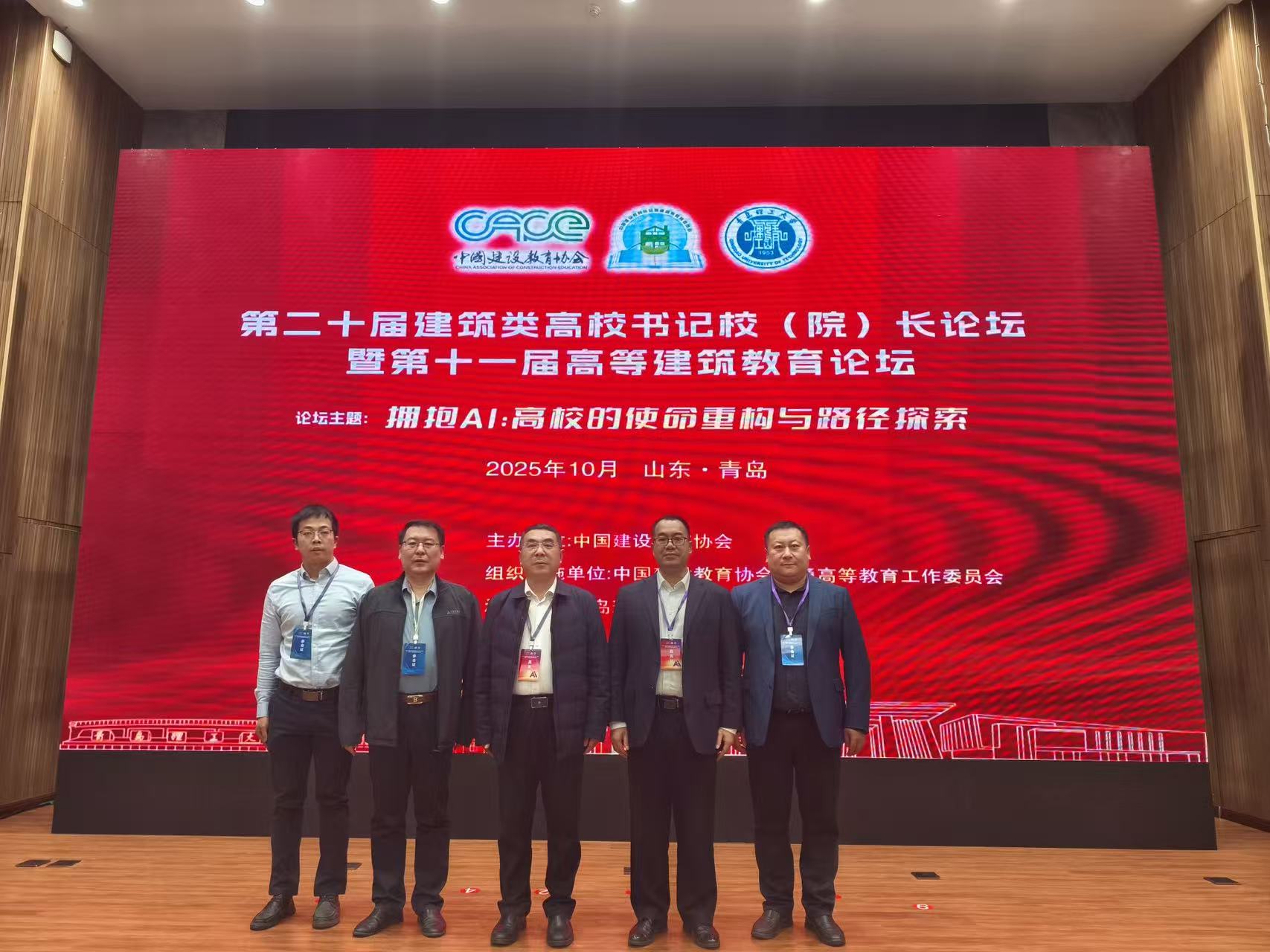 本网讯 10月25日,第二十届全国建筑类高校书记、校(院)长论坛暨第十一届中国高等建筑教育论坛在山东青岛举行。本次论坛的主题是“拥抱AI:高校的使命重构与路径探索”。中国建设教育协会理事长刘杰,政府部门领导,青岛理工大学党委书记杨赟,北京建筑大学校长张大玉等同志,西安建筑科技大学、沈阳建筑大学、安徽建筑大学等十余所高校的书记、校(院)长齐聚一堂,共谋发展。校党委副书记、校长蔡国军,校党委常委、副校长杨科带领相关部门参加论坛。