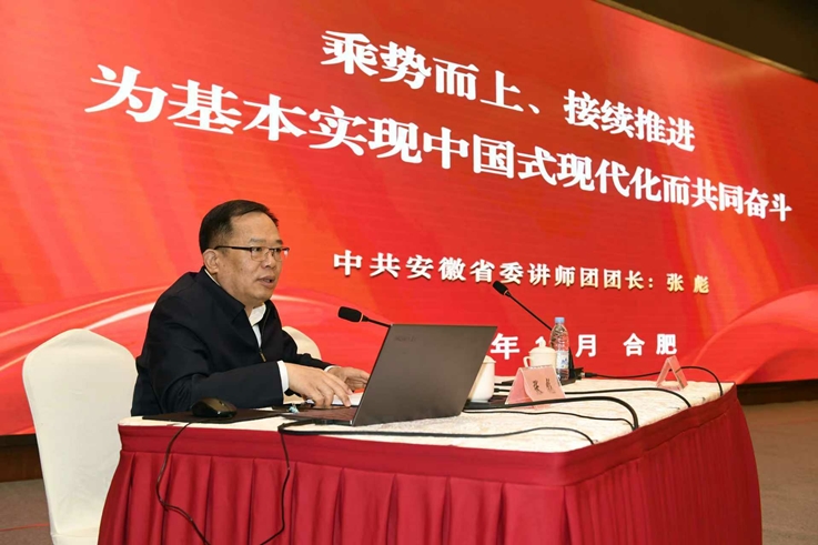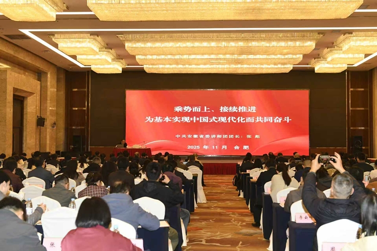 张彪紧紧围绕习近平总书记在党的二十届四中全会上的重要讲话精神和《中共中央关于制定国民经济和社会发展第十五个五年规划的建议》,以《乘势而上、接续推进,为基本实现中国式现代化而共同奋斗》为题,从“深刻认识全会的重大意义”,“准确把握“十五五”时期在基本实现社会主义现代化进程中的重要地位”,深刻领会“十五五”时期经济社会发展的指导方针和主要目标,全面理解“十五五”时期经济社会发展的战略任务和重大举措,坚持和加强党的全面领导,凝聚起推进中国式现代化的磅礴力量等方面,紧密结合安徽实际,对全会精神作了全面系统宣讲和深入解读阐释。