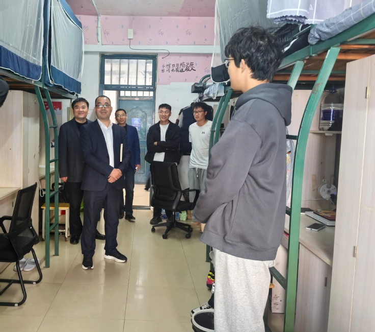 杨科一行深入学生宿舍,实地查看内务卫生、生活环境、设施运行情况,并与同学们亲切交谈,详细了解学生学习进度、思想动态和急难愁盼问题。杨科表示,宿舍是同学们在大学期间的“小家”,学校将积极回应关切,持续优化条件与服务,让大家住得安心、过得舒心。他还叮嘱同学们要增强安全意识,注意用水用电安全,做到和睦互助,共同营造安全、健康、文明、和谐的居住环境。