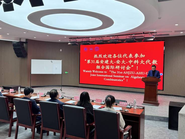 本网讯 近日,第31届安建大-安大-中科大代数组合国际研讨会在安徽建筑大学南校区徽智楼一楼报告厅召开,来自美国、俄罗斯、法国、荷兰、日本等国的代数组合相关学科专家学者,以及北京交通大学、中国科学技术大学、安徽大学和我校国际交流合作处、运筹学与数据科学实验室、数理学院研究生等六十余名师生代表参加了此次会议。数理学院院长余江应教授致开幕辞。会议由学院谭莹莹教授主持。