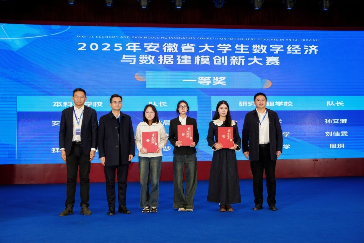 本网讯 近日,由安徽大学经济学院、新华学院财会与金融学院、蚌埠学院经济与管理学院承办的2025安徽省大学生数字经济与数据建模创新大赛在蚌埠圆满落下帷幕。安徽建筑大学学子与来自安徽大学、安徽农业大学、安庆师范大学、阜阳师范大学等众多队伍同台竞技,最终我校周琪、卢旭东、王毅分别组建的团队分获研究生组一、二、三等奖各1项,汪晓君组建的团队获本科生组二等奖1项。
