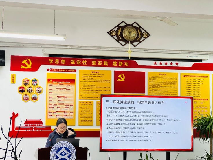 支部汇报环节,项锦雯汇报了近三年土管系教师党支部在“党建+专业建设”融合发展中取得的成绩,展示了支部在产学研合作、人才培养、课程建设、社会服务等方面的具体实践。2025年国家自然科学基金项目获得者、支部党员王鹏、汤峰分享了项目申报经验,为全系教师提升科研能力提供了宝贵借鉴;党员张童、王玉纯结合多次在课程思政教学竞赛和教学创新大赛中的优异表现,畅谈了如何将思政元素有机融入专业课堂,生动诠释了“为党育人、为国育才”的使命担当。