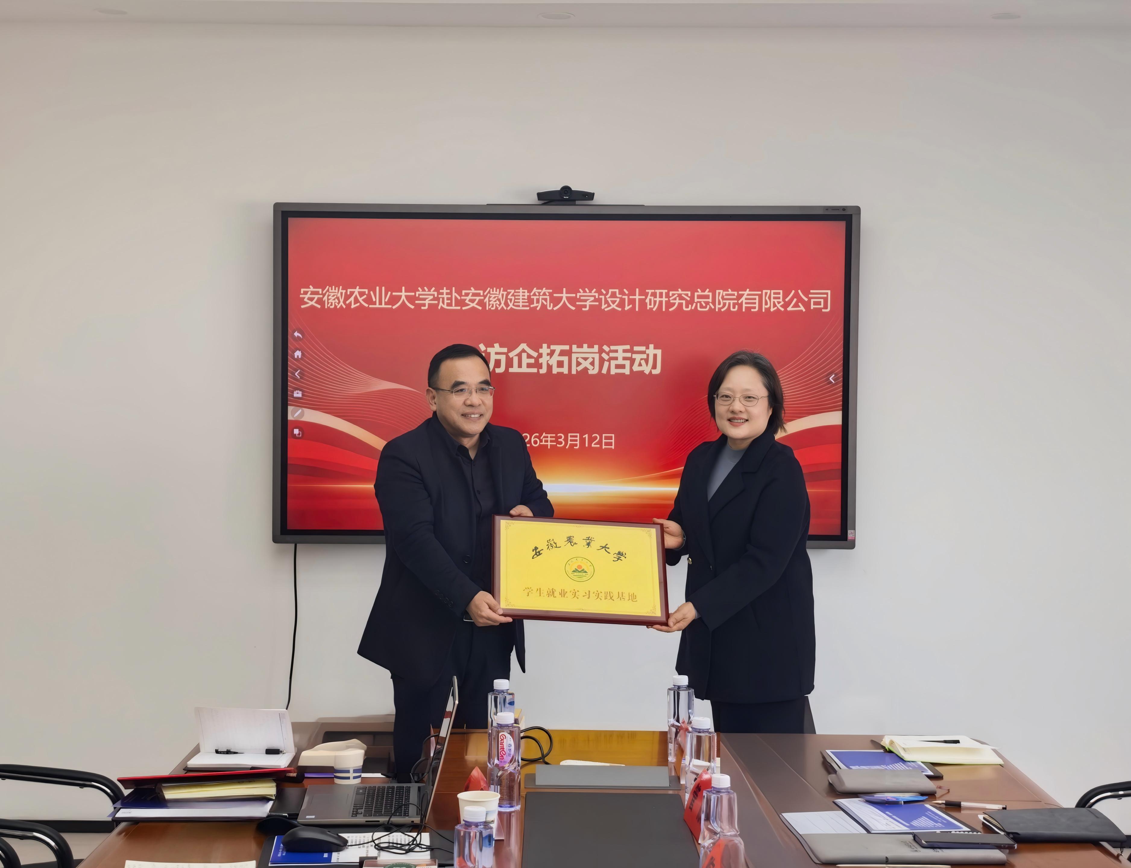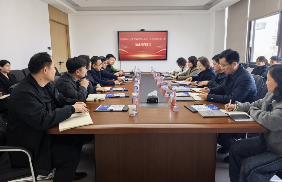 本网讯 近日,安徽农业大学党委常委、副校长李红率队赴安徽建筑大学设计研究总院有限公司(以下简称“设计总院”)开展“访企拓岗促就业”活动。学校党委副书记李早,产业管理处处长兼资产经营公司董事长丁琨热情接待李红一行。