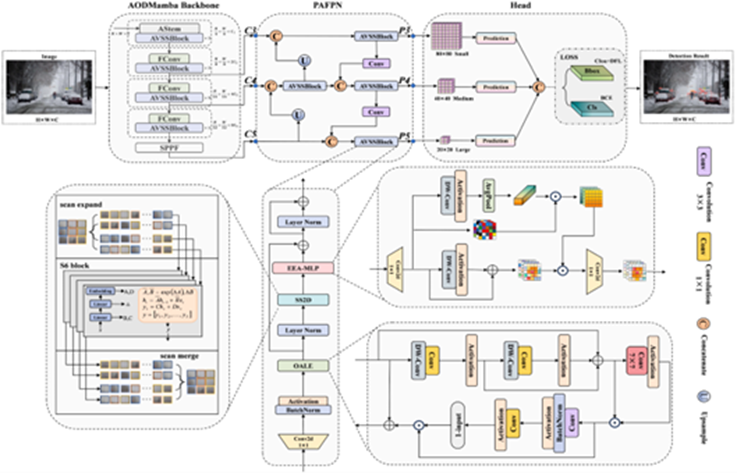 针对上述问题,研究团队创新性地提出一种高效计算架构EEnvA-Mamba,旨在兼顾实时推理速度与高精度检测性能。为验证方法有效性,研究团队构建了一个针对雪地场景的专用数据集VOC-SNOW a,覆盖多种光照条件与降雪强度。实验表明,所提方法在检测精度上达到行业领先水平,AP指标达66.4%,较现有最优模型高出4.5个百分点。