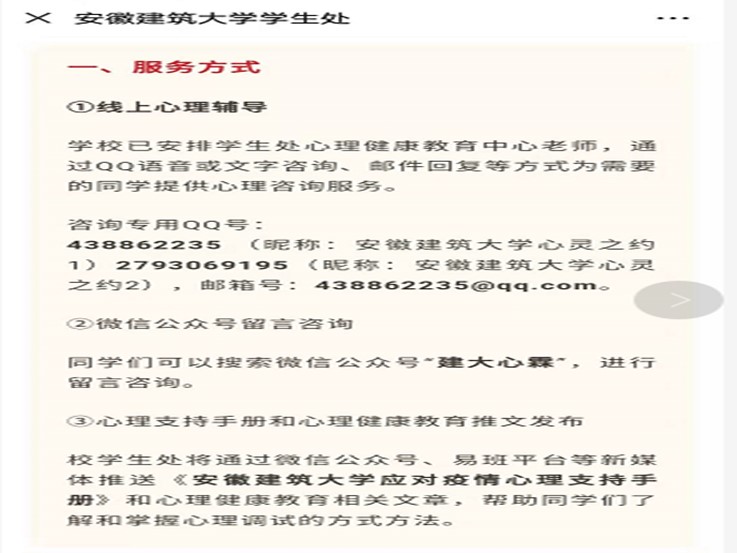 为了帮助同学们缓解因疫情引发的负面情绪,以理性平和的心态面对疫情,学校开通了心理咨询网络辅导和热线服务。心理健康教育中心老师通过QQ语音或文字咨询、邮件回复和微信公众号留言咨询等方式在每天上午九点至十二点,下午两点至五点,为安徽建筑大学学生提供线上心理辅导。
