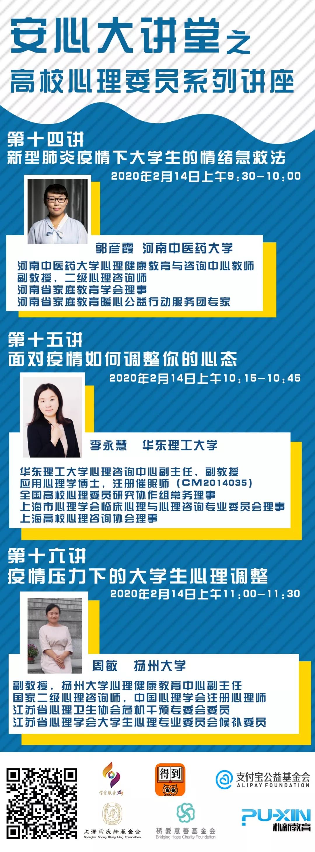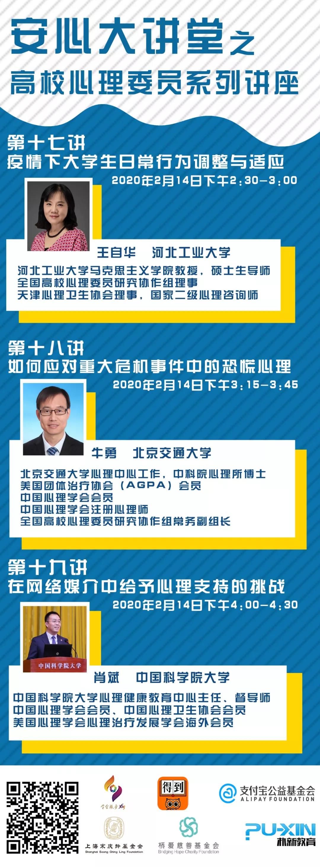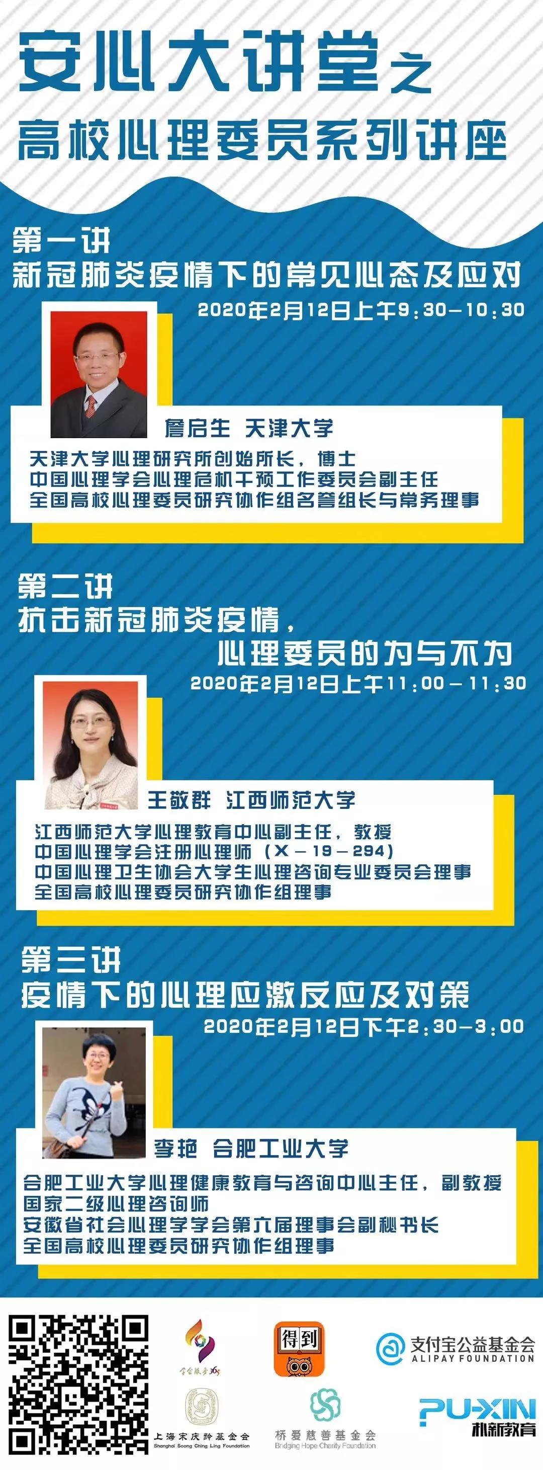 中国心理学会与中科院心理所联合开展的“抗击疫情安心行动”已于2020年1月30日晚正式启动,“抗击疫情安心行动”的高校组专家成员经过前期准备,决定在2月12-14日面向全国高校心理委员及其班级同学开展系列公益讲座,共18位专家组成员将开展20个专题讲座。